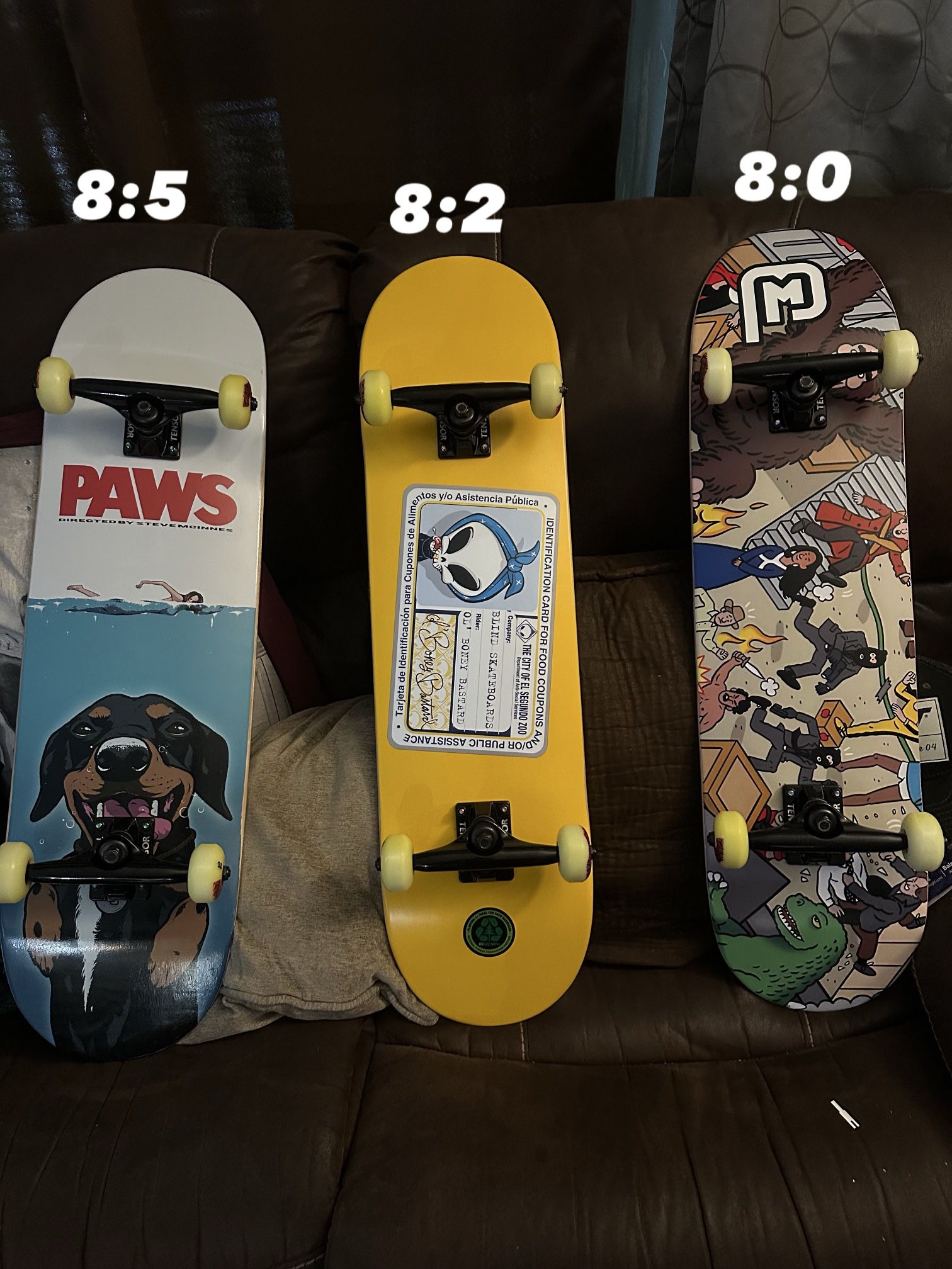Paws pro deck 8:5 $68 sold Enjoi 8:25. $65. !!!all New pro deck !!! Piin mafia 8;0 $65 Enjoi tequila $65