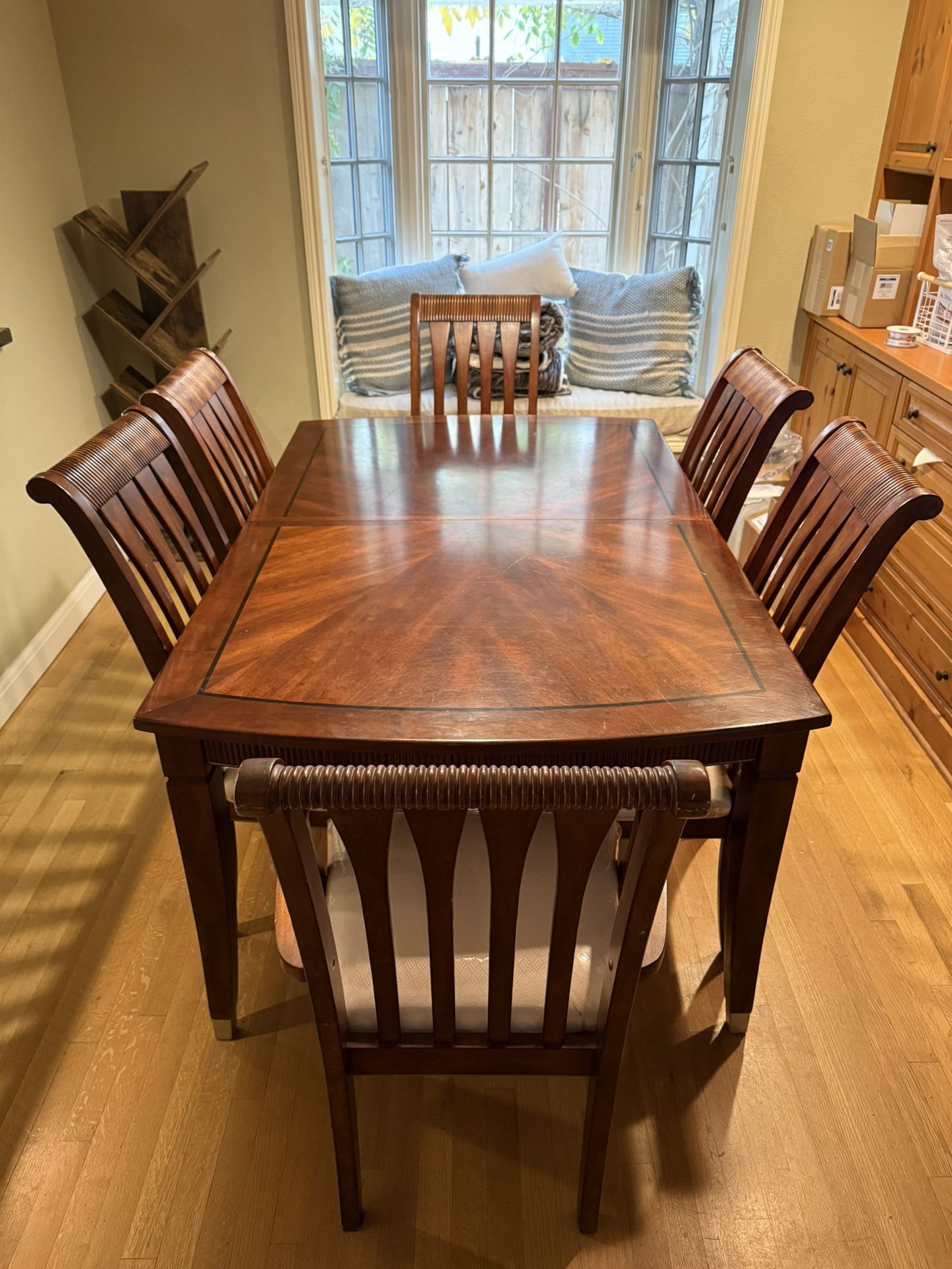 Solid wood dining table with 6 matching chairs, perfect for a dining room or kitchen nook. The table features a beautiful wood inlay top and a warm, rich finish. There are some surface scratches on the tabletop from normal use, and two chairs have been repaired (not professionally) - but are solid and fully functional. The set is sturdy, well-built, and comfortable — no wobbling. Ideal size for most homes without taking up too much space. Dimensions: • 42” wide × 66” long × 30” high • Seats 6 comfortably Details: • Solid wood construction • Includes table + 6 chairs • Clean, smoke-free home • Local pickup only Cash, Venmo, or Zelle accepted. Message me if interested — happy to answer questions