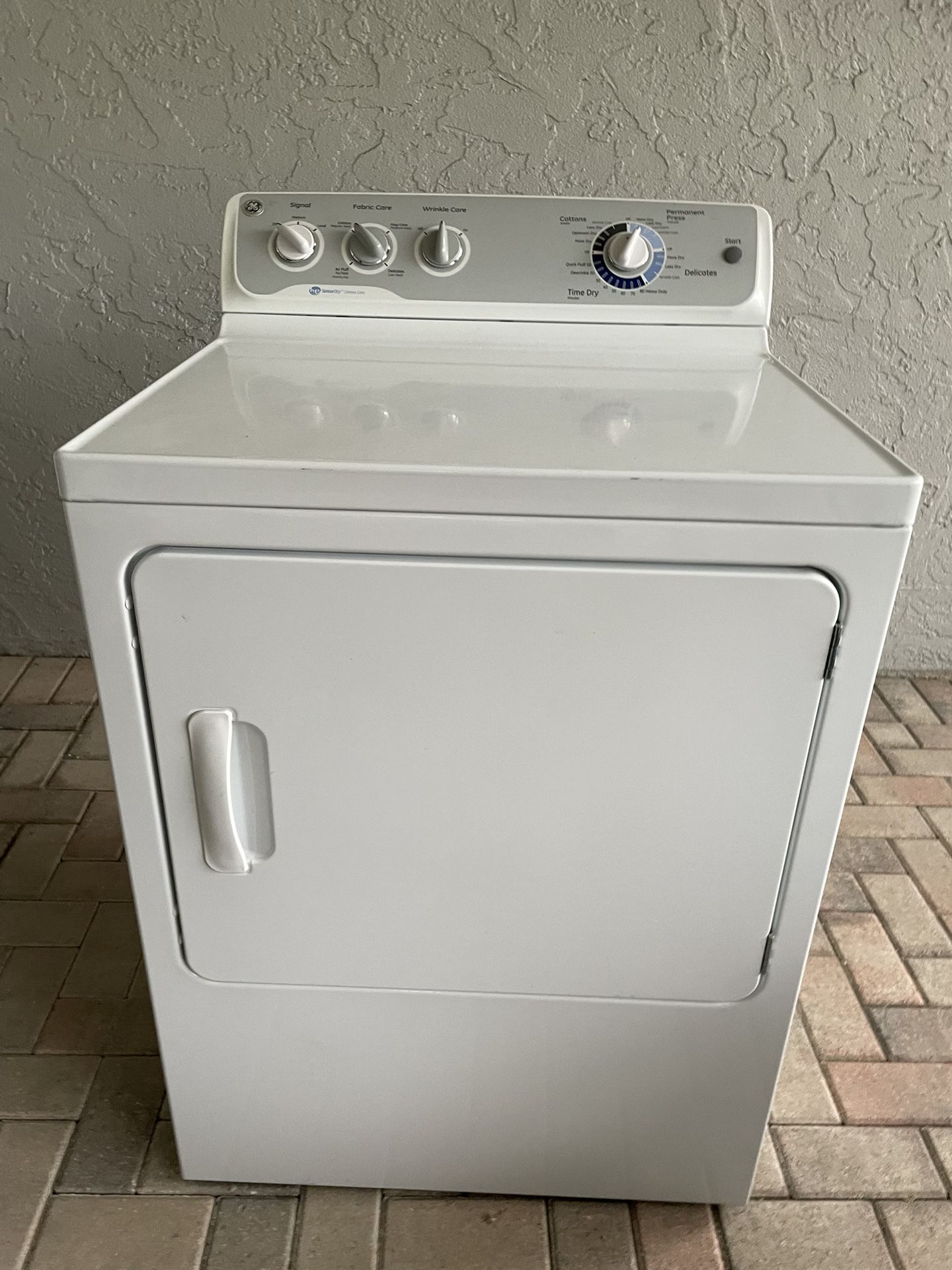GE white electric dryer, front load, multiple settings/options. Works great, getting rid of it cause we bought a new set. Electrical cord not included.