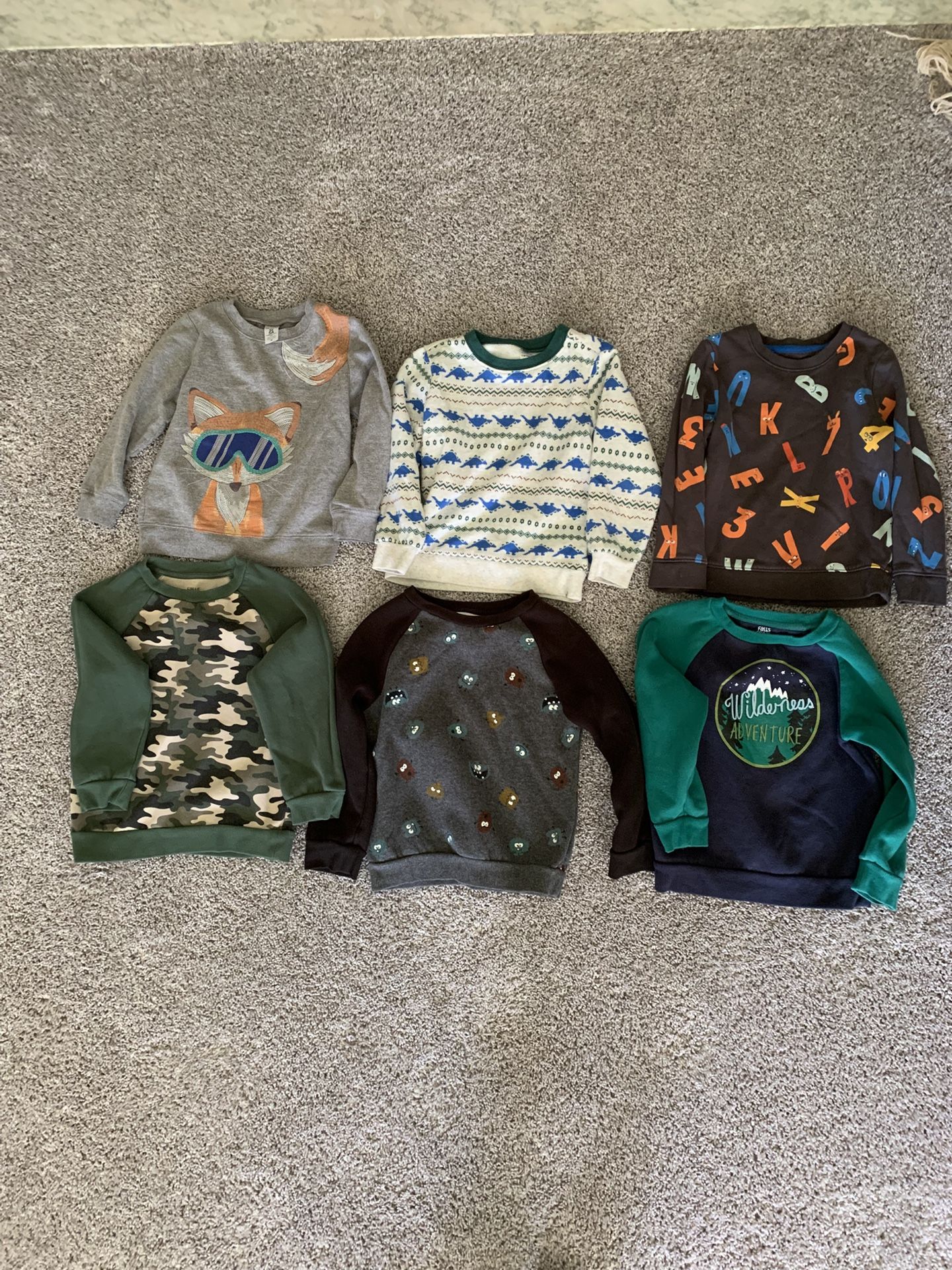 Bundled lot of six (6) crewneck (hoodless) sweatshirts, all size 5T. Three (3) are Fall’s Creek, two (2) are Carter’s and one (1) is Cat & Jack.