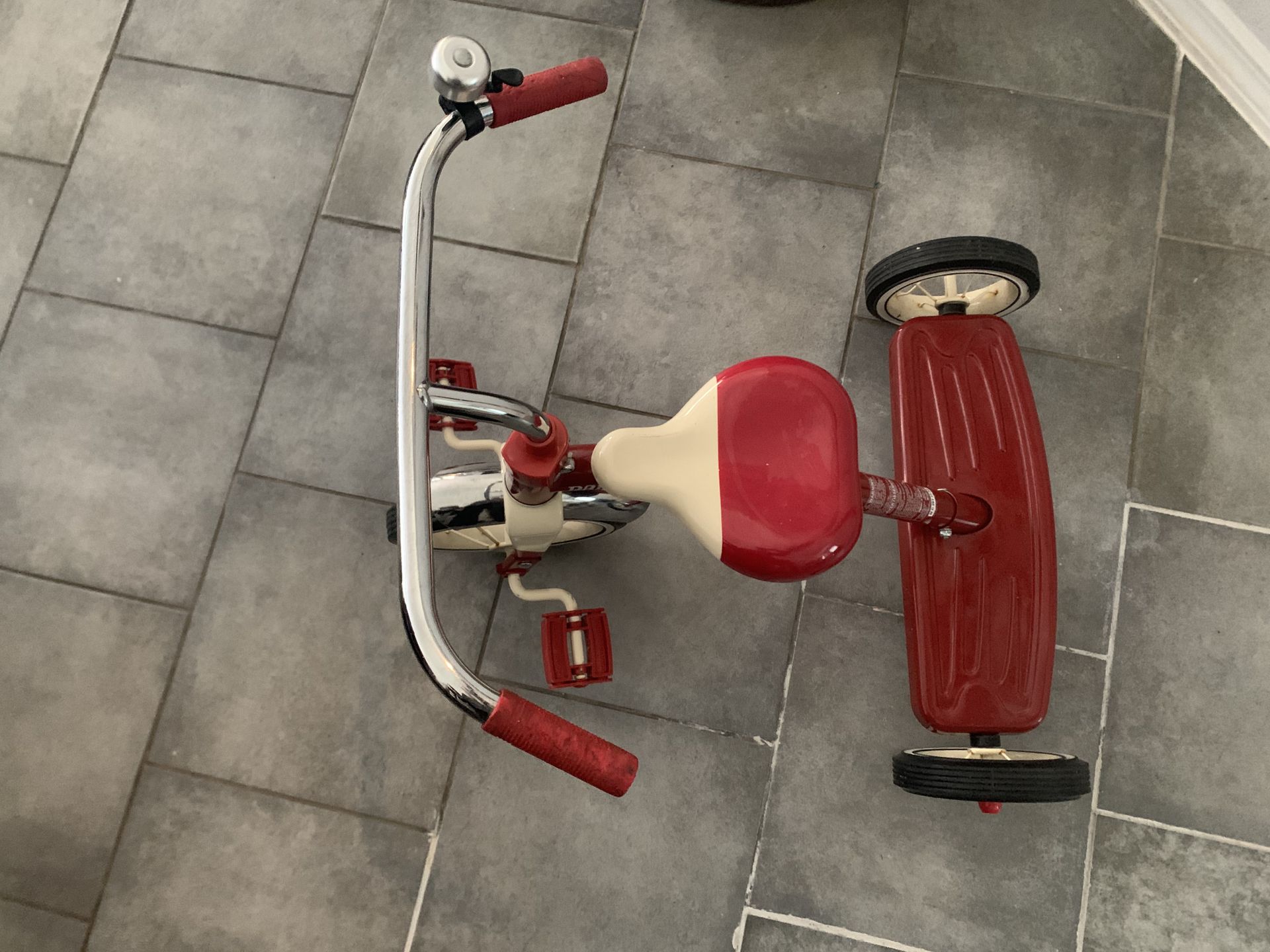 Classic red Radio Flyer tricycle in good condition. Preowned Radio Flyer Classic Red Tricycle, featuring a durable steel frame, chrome handlebars, and real rubber tires. • Ages: Designed for children between 2 and 4 years old. Weight Capacity: Supports up to 42.5 lbs. Features: Includes an adjustable seat that grows with the child and a chrome ringing bell. • Style: Retro design with a classic red finish, chrome fenders, and spoked wheels. Located in 32828