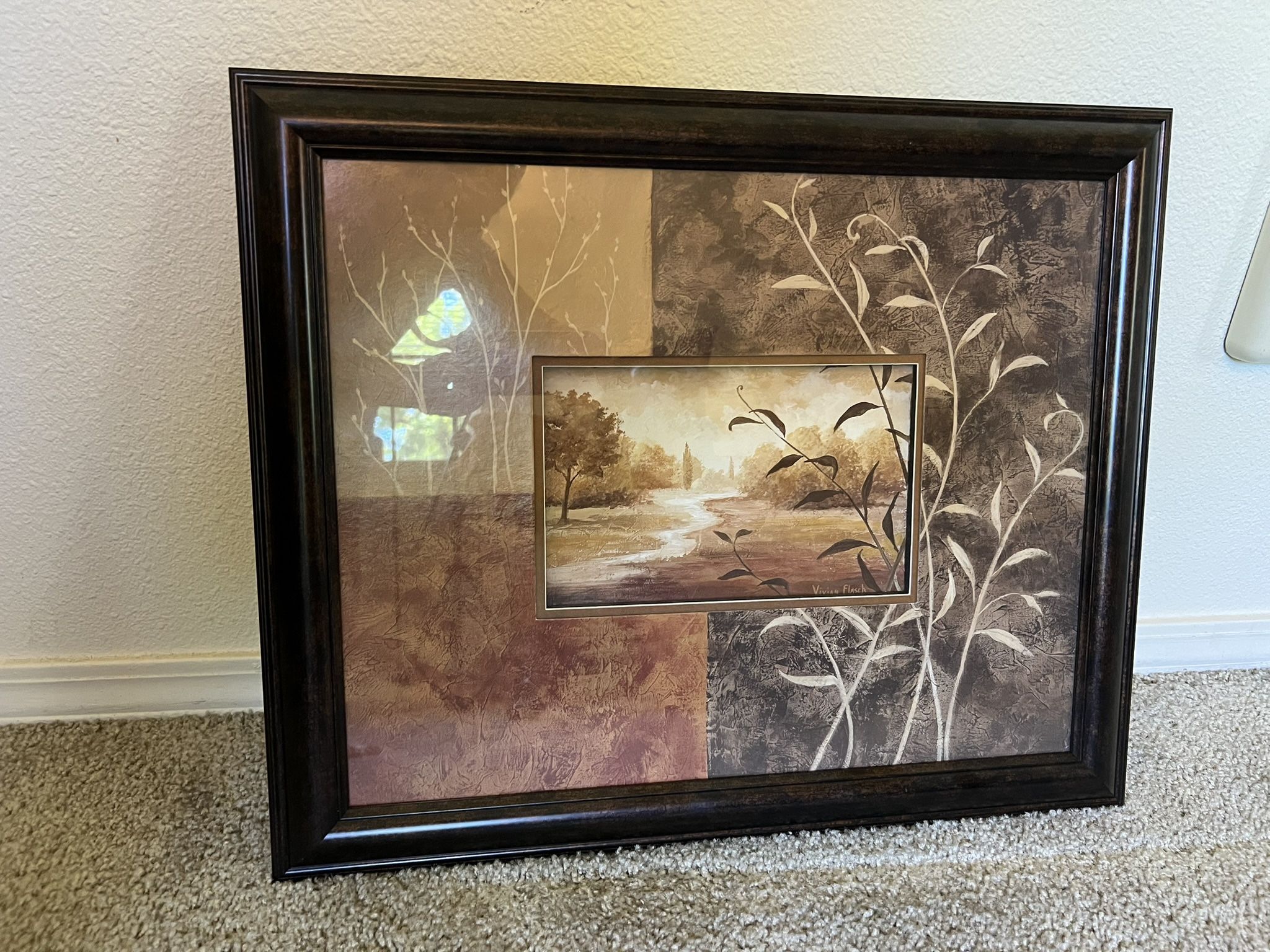 Beautiful framed wall art with warm earthy tones featuring a serene nature scene and leaf design. Perfect for living room, hallway, or office decor. Condition: Excellent, ready to hang.