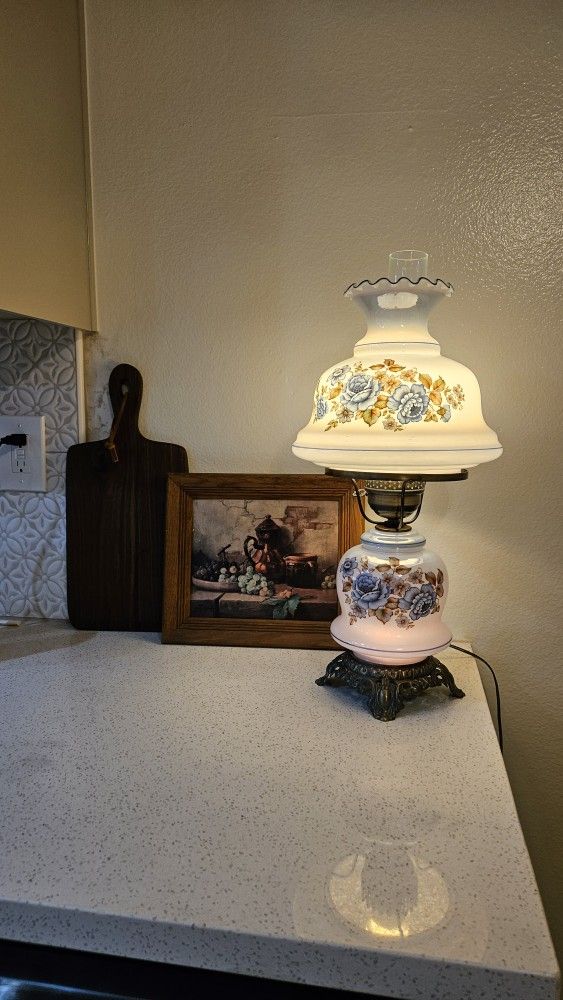 This vintage hurricane lamp is a beautiful addition to any collection. The lamp features a blue flower pattern on a glass material that is sure to catch the eye. The lamp shade fits perfectly with the lamp base, creating an elegant and timeless look. This item is perfect for anyone who loves collectibles or is looking for a unique lamp to light up their space. The lamp has been previously owned and has a history that adds to its charm. Don't miss out on the opportunity to add this stunning lamp to your collection. In very good vintage condition. The metal parts of the lamp are in excellent condition, with the luster coating it shines beautifully. The lamp circuit works; Double light fixture with night light on botton / main light / or both simultaneously. Height: 26" / Width: 10" / Weight: 10 lbs. Vntg Blue Flower Luster Gone With The Wind Floral Hurricane Lamp 26” 3 Way Light