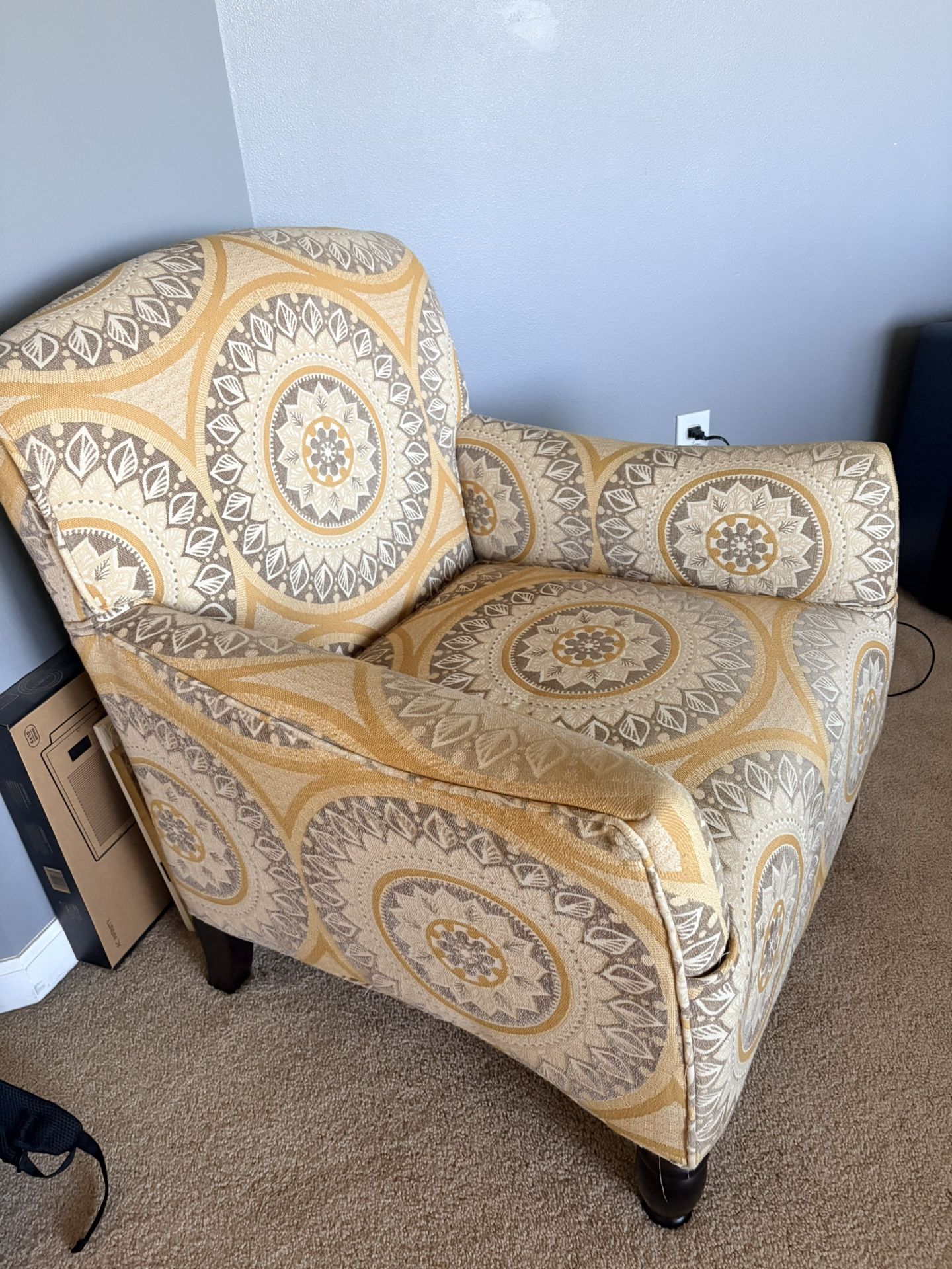 Beautiful like new armchair. PierOne yellow medallion pattern. Looks great in a bedroom
