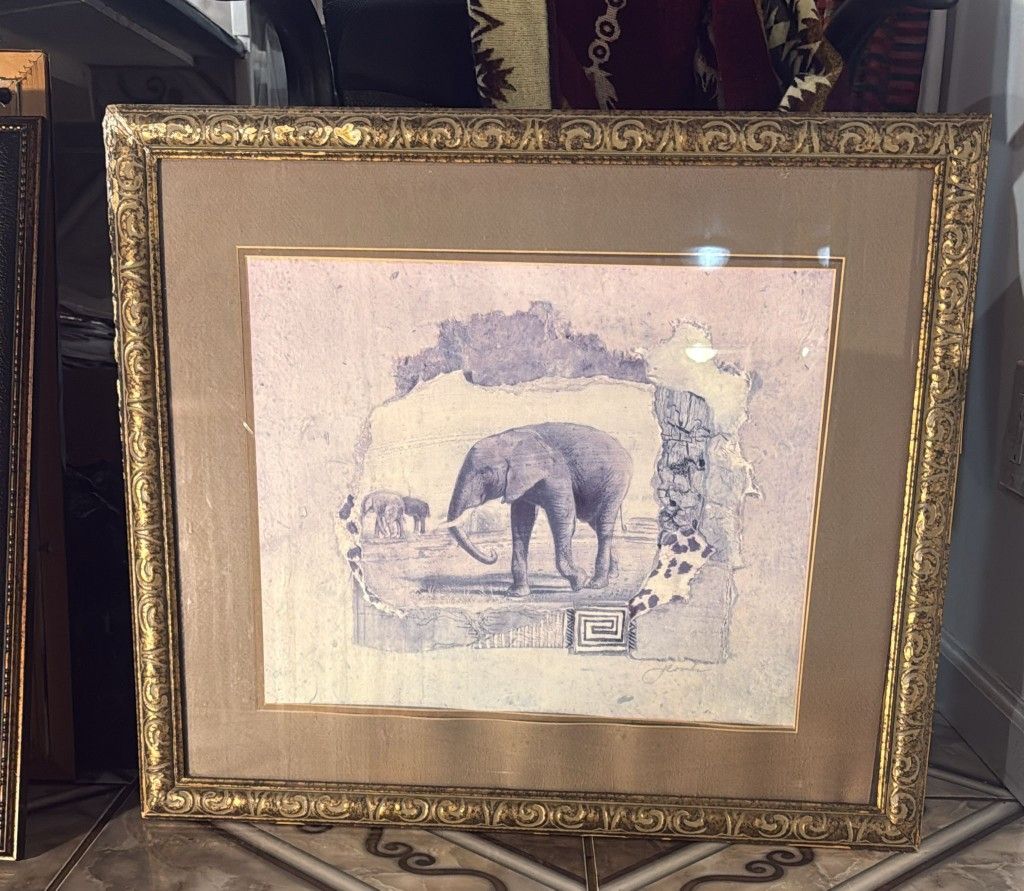 Framed 27x24 inch picture with an illustration of two African elephants in a savanna landscape.