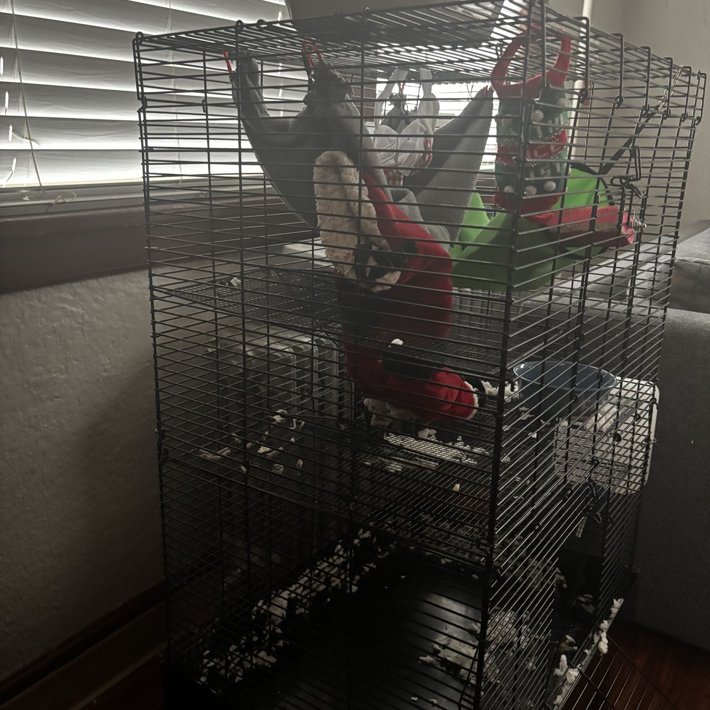 Three level cage comes with hammocks water bottle dispenser food bowl, litter bowl and foldable play pin, also some food pellets and bedding