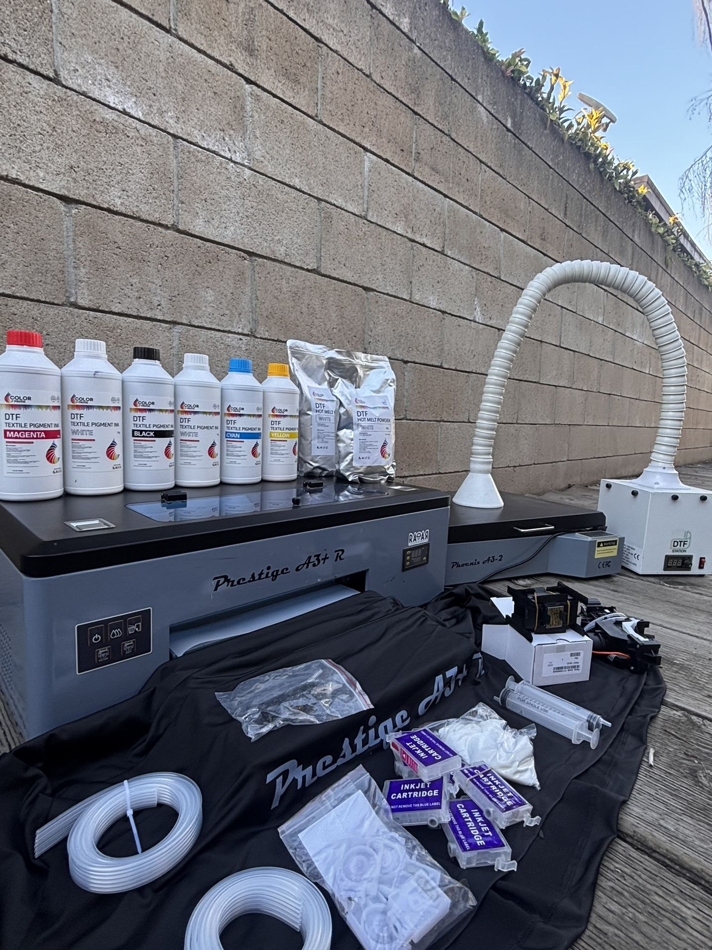 Dtf printer print up to 12.750 wide Comes with CMYK ink one white new bottle. The others are pretty full. I believe more than halfway and they’re still ink in the tank. Comes with two powder bags Comes with a new print head so when you start, you will have no issues. I will only install once you pass the money I will install in front of you. Everything is sold as is there’s a curing of and a filtration system for the curing oven if you can see in the pictures I bought this from All Amercian Print Supply so any issues you can call them they have everything in stock for this machine and they have great support system