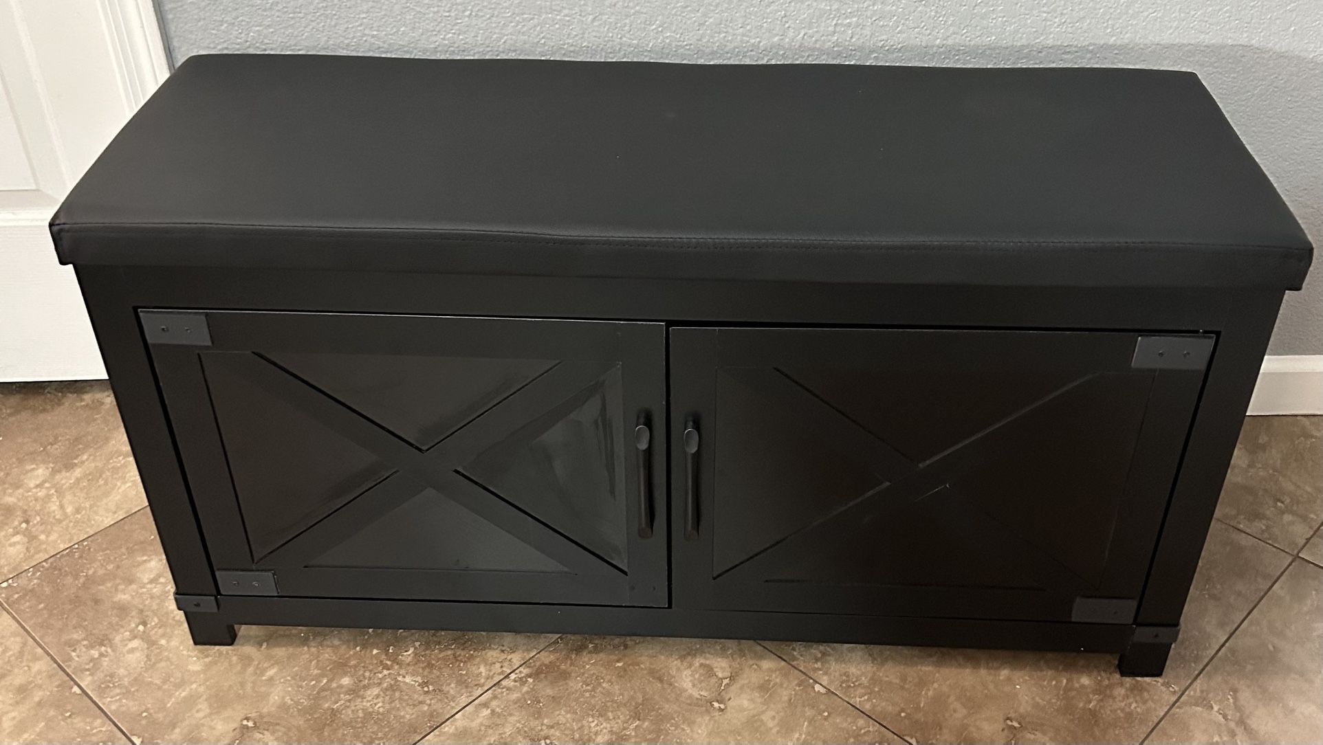 This is a brand new Hzuaneri shoe storage bench with 2 tier adjustable shelves, 2 barn style doors and padded seat cushion. Measures 14”D x 40”W x 20”H. $55