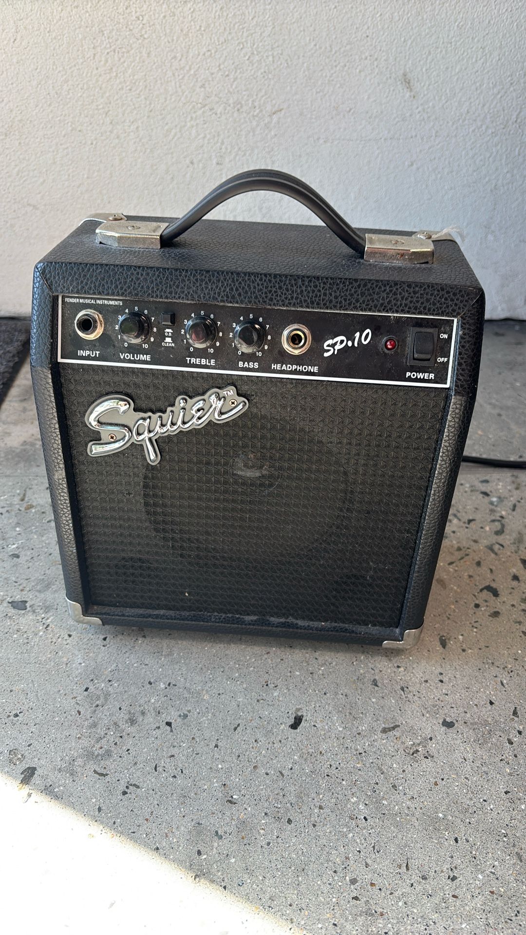 Used Squier SP10 1X5 10W Guitar Combo Amp in fair condition, perfect for beginners or practice sessions. This compact amp features a single 5-inch speaker, delivers 10 watts of power, and includes basic tone and volume controls along with overdrive switch for added versatility. Ideal for casual jamming or portable use, it offers simple plug-and-play convenience. Exterior shows wear consistent with age and use, but functionality remains solid.