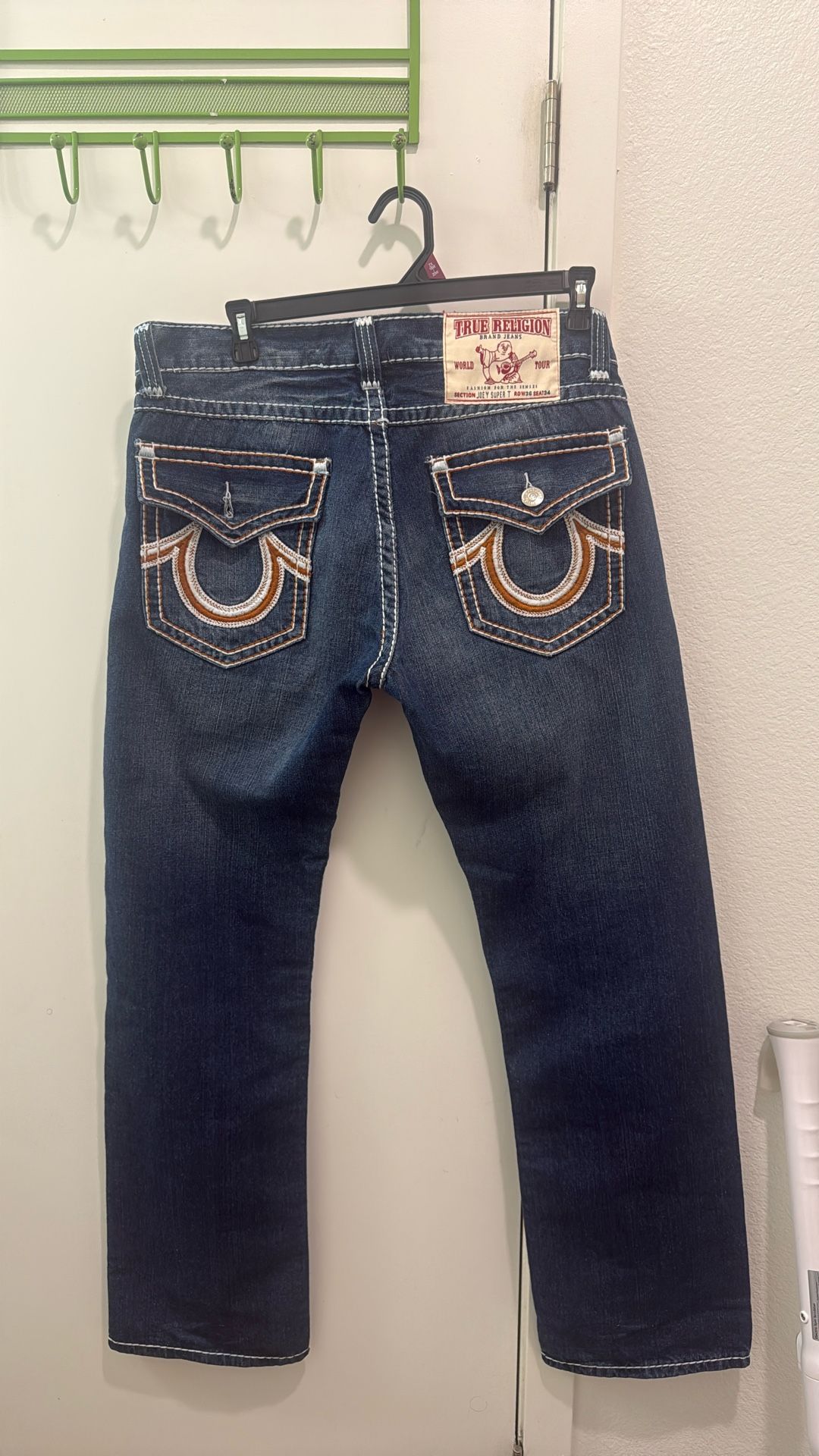 True religion jeans Joey fit. baggy jeans size 36, true to size. perfect to wear with cowboy boots, timberlands, or bulky shoes. Good quality jeans in great condition. Back left button fell out.
