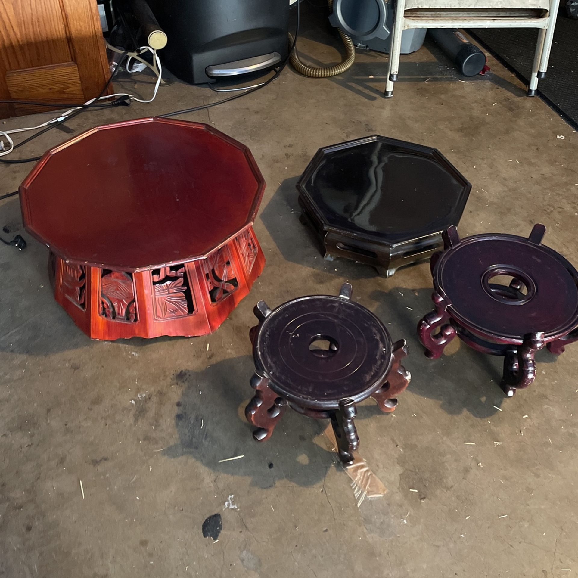 Vintage stands for Chinese flower vases different sizes and carved wood 1 piece red mahogany color 3 wood 1 hard plastic I’m asking $100 all 4 pieces I’m firm on price ridiculous offers will be ignored thanks Santa Ana area