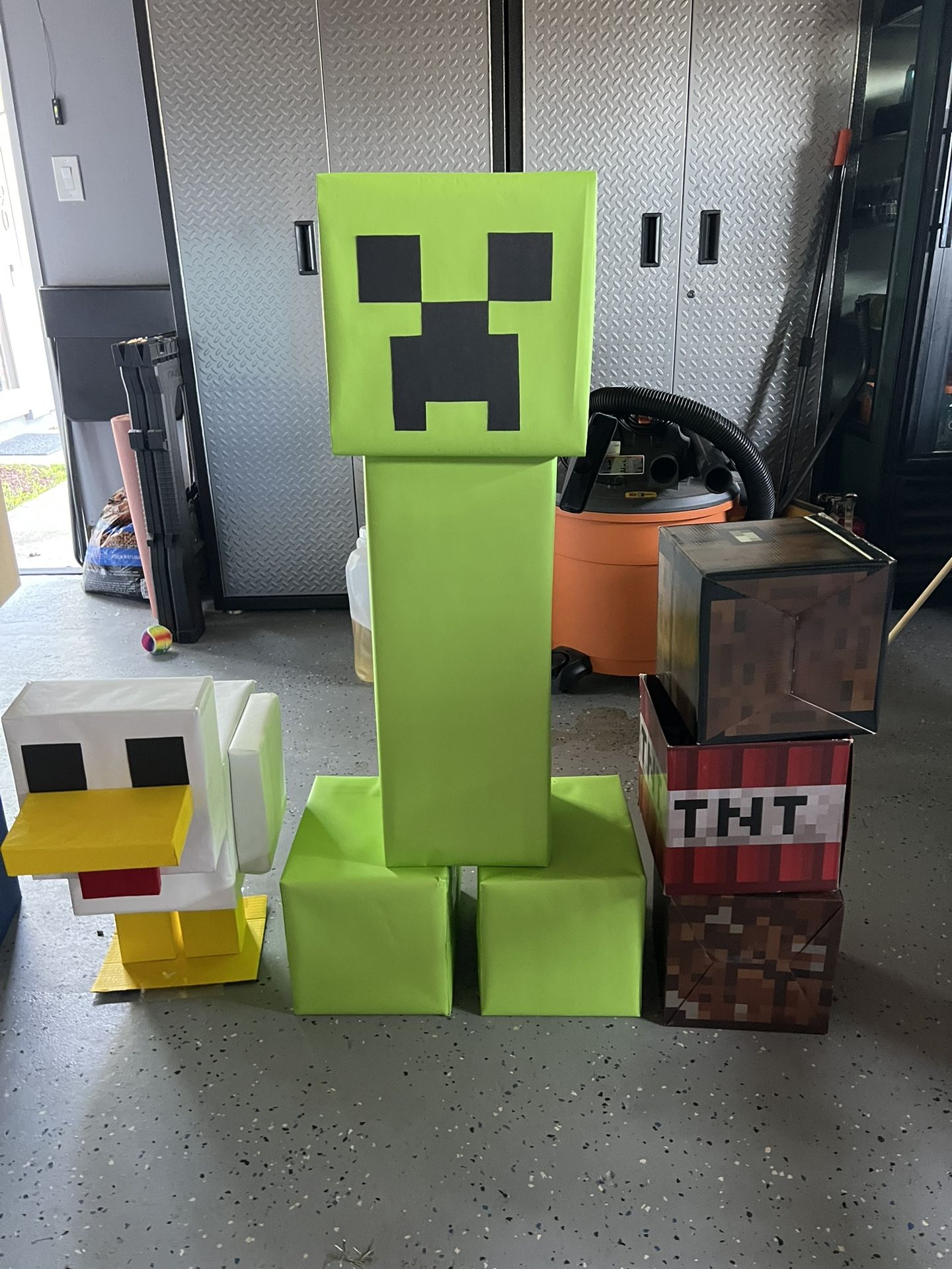 Home made Minecraft decorations. Used fora kids bday party. One giant cardboard Steve, creeper and chicken. 3 small tnt boxes. Minecraft fabric and lava chicken sign.