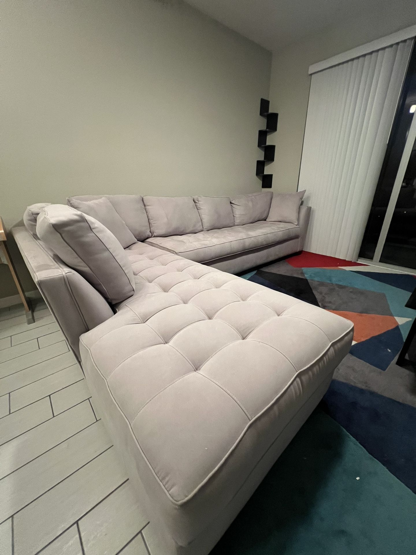 The couch is Cindy Crawford. The color is a light blue/grey & is suede. Here are a couple pics & the dimensions. $1900 is full price for new. If you like it, make me an offer and we can go from there.
