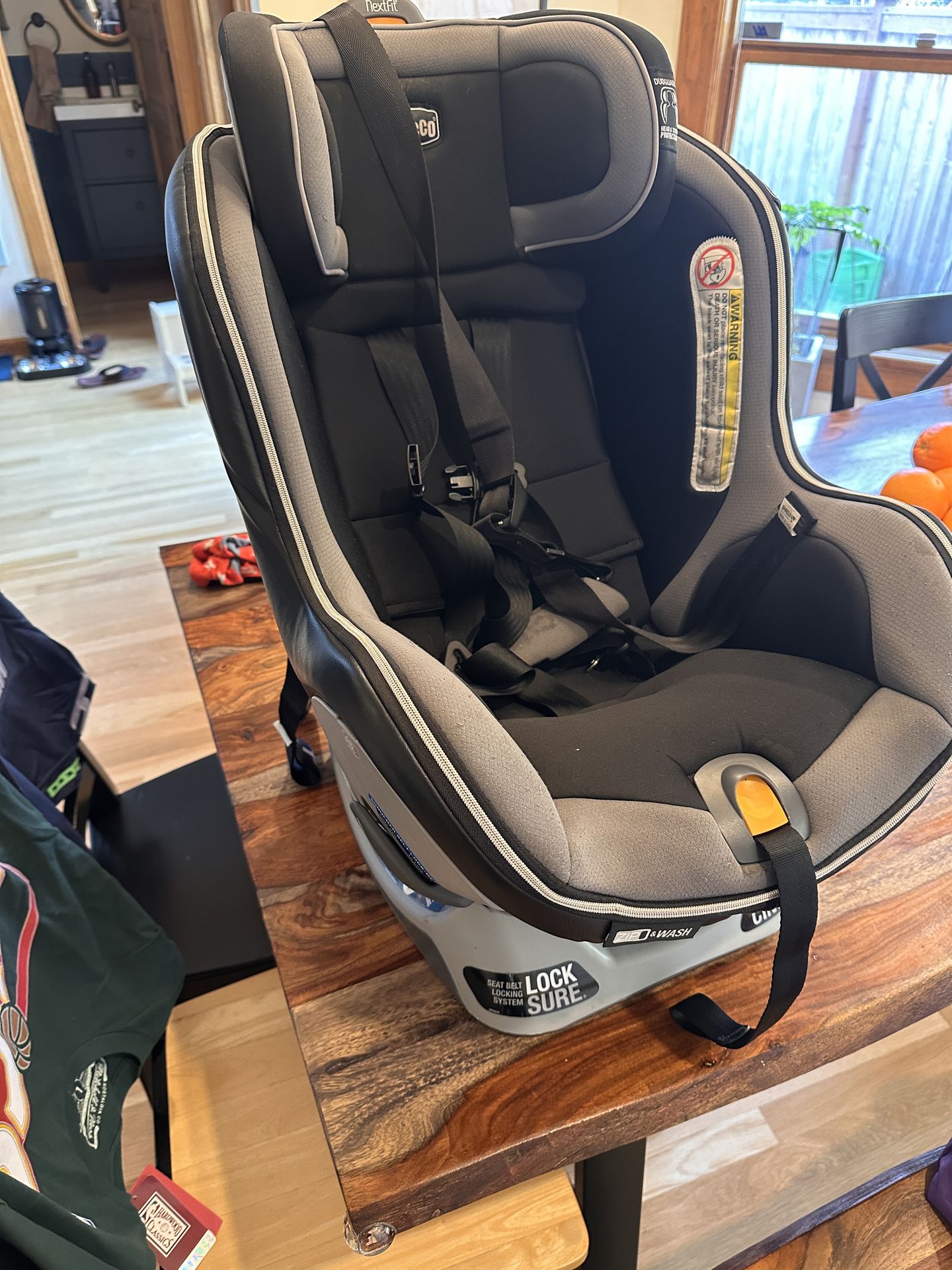 NextFit Zip car seat. Chicco brand. Well rated on Amazon (4.8 stars). In great shape. It works for both infants in the 5-40 pound range as well as toddlers in the 25-65 pound range. We used it for our toddler. I have all the extra padding and straps to use it for an infant. 9 position recline, head and torso protection, very easy to install (I have the manual). It attaches to the LATCH system in cars and is extremely secure. Purchased for $315 plus taxes in late 2023 / early 2025. We don’t need it anymore as our kid has grown past it.