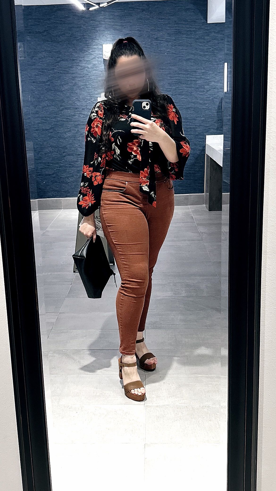 Size L Black and Rose blouse and Size 32 Levi Shape Leggings. Shoes optional, size 9