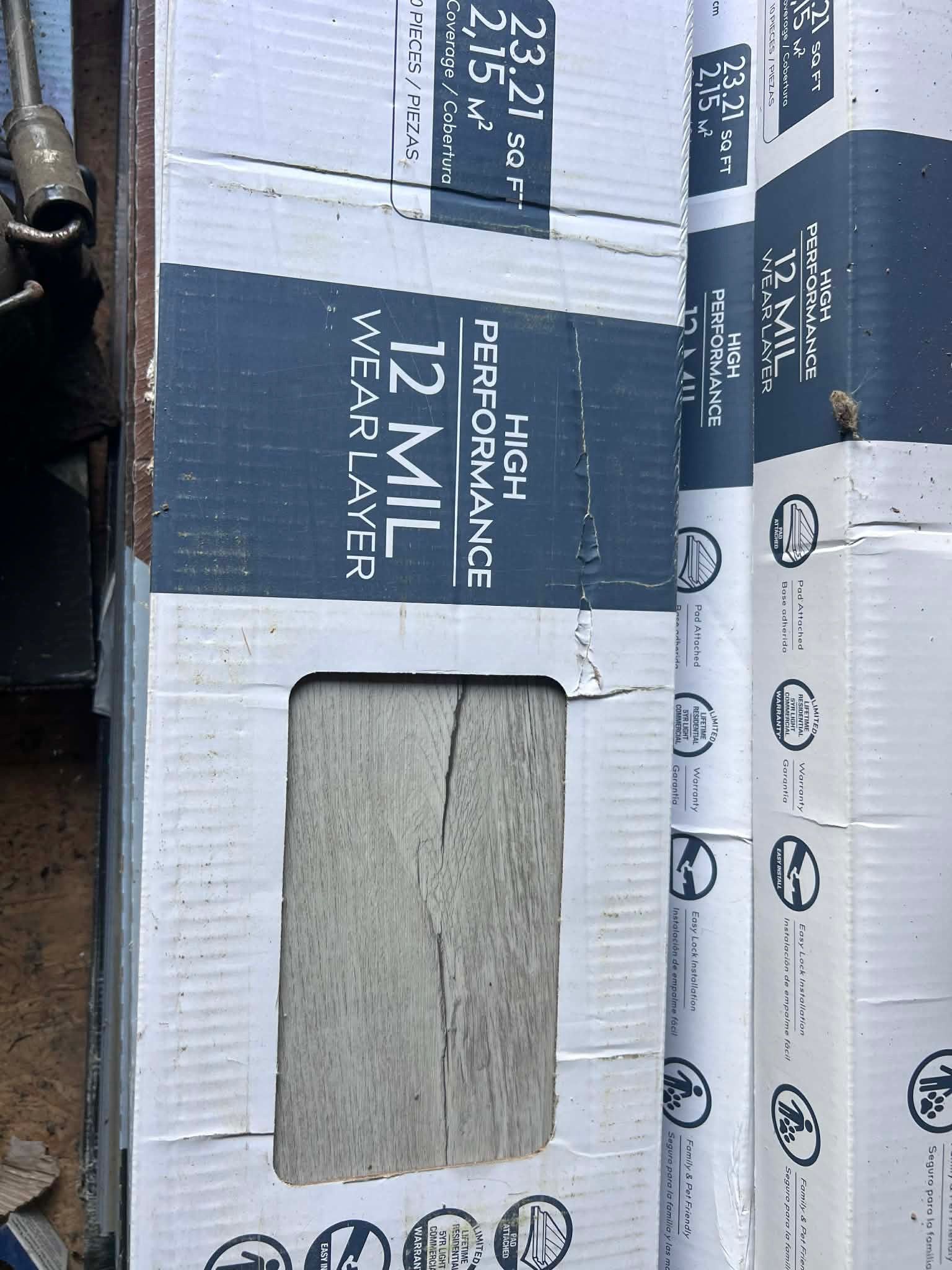 Luxury vinyl plank flooring with 12 MIL wear layer, brand new in original boxes. • Wear layer: 12 MIL (high performance) • Coverage per box: 23.21 sq ft • Total coverage: ~69.6 sq ft (3 boxes) • Color: light gray / wood look (see photo) • Durable, scratch-resistant, and water-resistant • Easy installation (click-lock) Never installed. Boxes are stored properly. Ideal for small rooms, bedrooms, closets, or repairs. Sold together. ⸻ Piso vinílico tipo tabla (LVP) con capa de uso de 12 MIL, nuevo y sin instalar, en sus cajas originales. • Capa de uso: 12 MIL (alto desempeño) • Cobertura por caja: 23.21 pies² • Cobertura total: ~69.6 pies² (3 cajas) • Color: gris claro / efecto madera (ver foto) • Resistente al agua y a rayones • Instalación fácil tipo click Nunca instalado. Cajas bien almacenadas. Ideal para cuartos pequeños, closets, oficinas o reparaciones. Se vende todo junto.