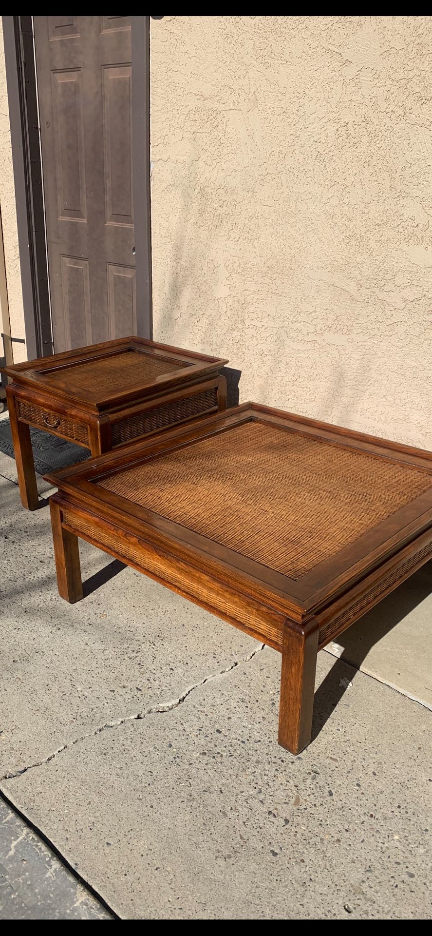 Excellent condition coffee table set. Quality real wood, wicker & glass top. Large table 3ft 2in squared and 1ft 6in tall. Smaller table 1ft 10in wide, 2ft 2in deep & 1ft 11in tall. Both structurally sound. Brown/Tan. Flawless. No scratches. $60 obo. Delivery available for a fee depending on location.