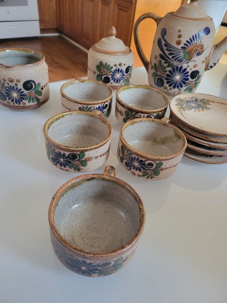 vintage Mexican Tonala pottery tea or tequila set, hand-painted with bird and floral folk art designs.