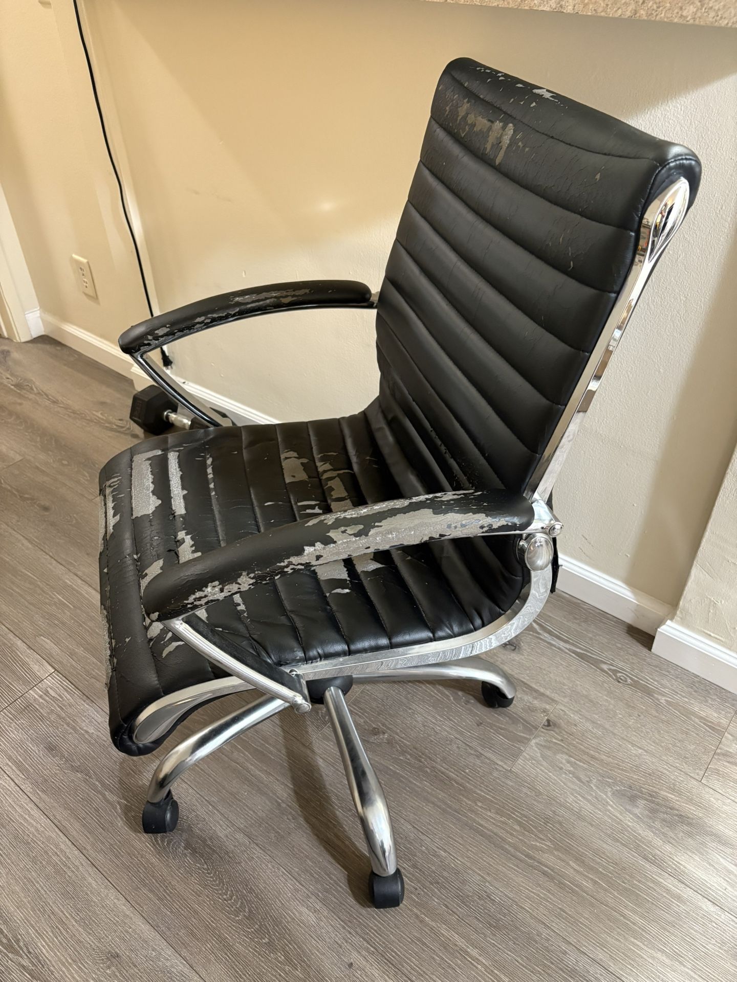 Selling a used office chair with wheels. Comfortable and wheels roll great. • Functional but shows signs of wear (scratches, scuffs, fabric wear). • Adjustable height works fine. • Swivels and rolls smoothly on wheels. • Ideal for home office, garage, or as a project chair.