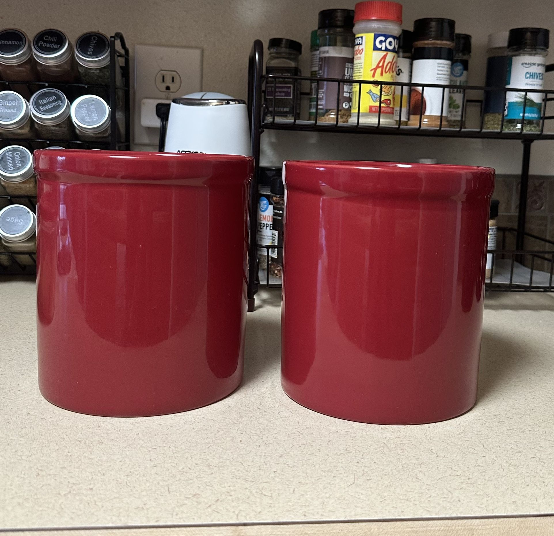 Two red kitchen crocs. 7" x 6.5" ceramic