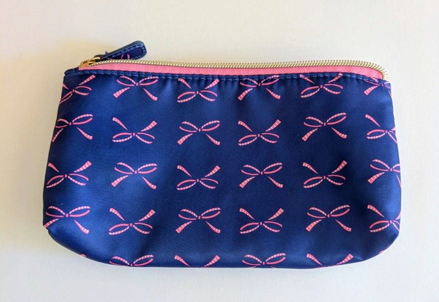 Clutch Cosmetic Makeup Bag Navy Blue Pink Ribbons Pattern Zippered Closure