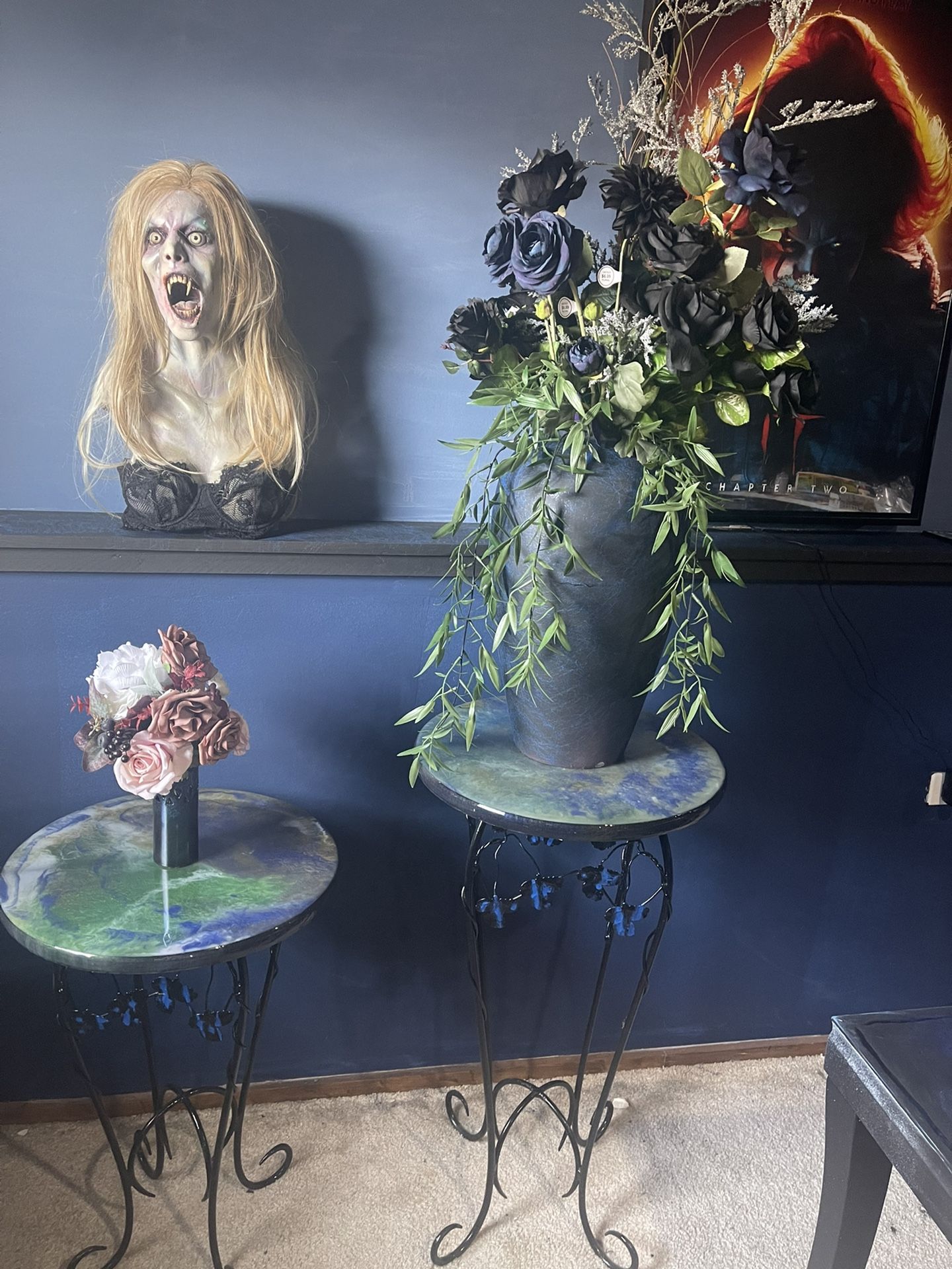 2 custom made vase table stands Stands are custom welded steel and tops are custom epoxy coated. Large vase is not included. Ablo español