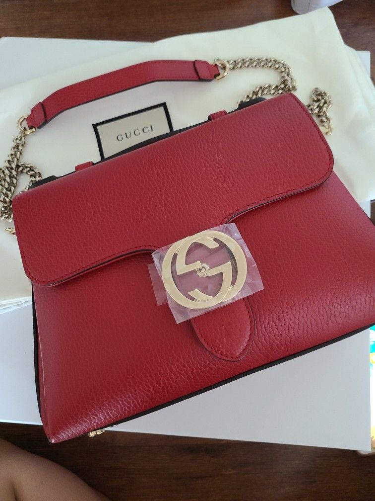 Authentic Pebbled Scratch Resistant Leather Gucci Tote Bag. Color: Red. Capacity: Medium. Chain Crossbody is Removable. Top handle and frontal GG logo clasp. New, never been used. Comes with Dustbag.