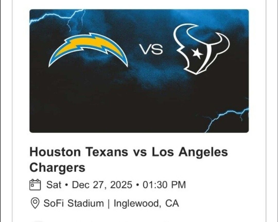 I have two tickets for the chargers and Texans December 27 th . Section 520 asking 100 each come pick up or I'm able to transfer Via email