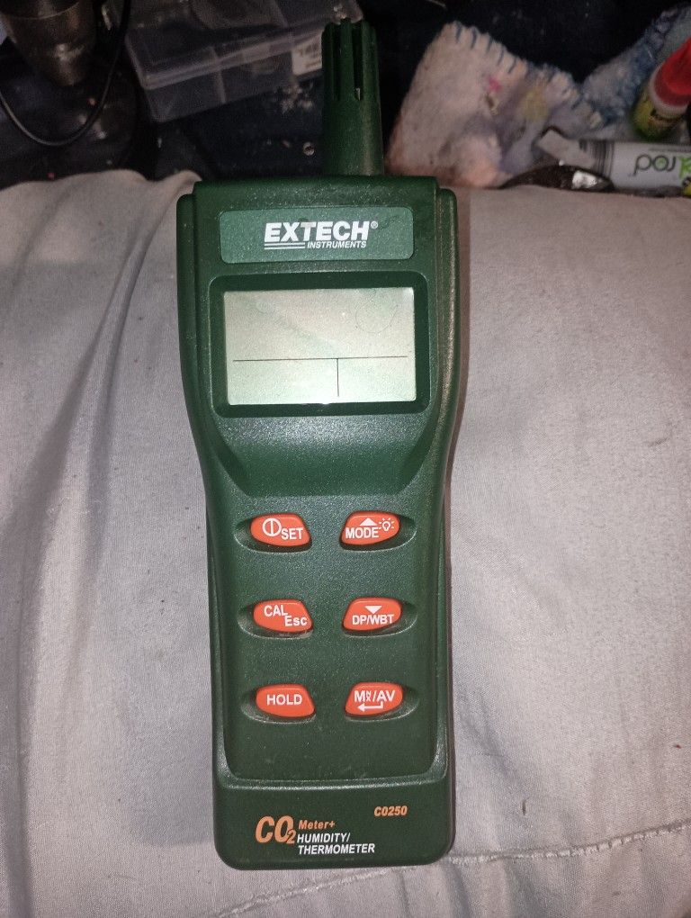Extech CO250: Portable Indoor Air Quality CO2 Meter Measures Carbon Dioxide (CO2), Temperature, Humidity, Dew Point, and Wet Bulb Features: Checks for Carbon Dioxide (CO2) concentrations Calculates statistical weighted averages of TWA (8 hour time weighted average) and STEL (15 minute short term exposure limit) Maintenance free NDIR (non-dispersive infrared) CO2 sensor Measurement ranges: CO2: 0 to 5,000ppm Temperature: -14 to 140°F (-10 to 60°C) Humidity: 0.0 to 99.9% User programmable audible alarm Backlit triple LCD display Built-in RS-232 interface for capturing readings on PC Data acquisition software and cable included to record and document CO2, Humidity and Temperature data Optional 33% and 75% RH calibration bottles Complete with software and cable, 4 AA batteries, and carrying case Originally bought for $475