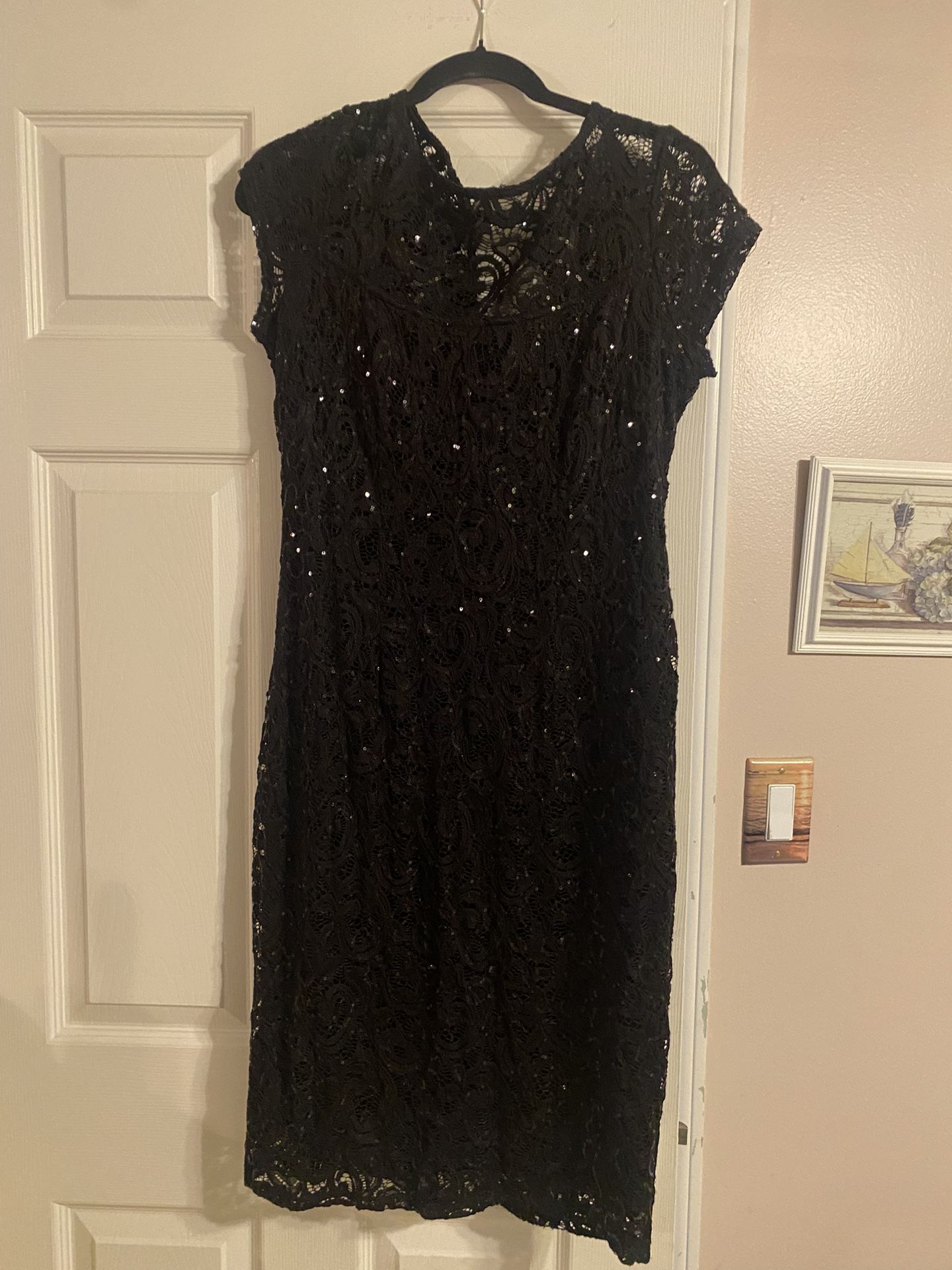Marina brand, black lace overlay with sequins. Lined. Above bust is see thru lace. Size 12, which would be around a large. Clasp neckline and zip up back. Pick up in Bellevue or Seattle. Cash only