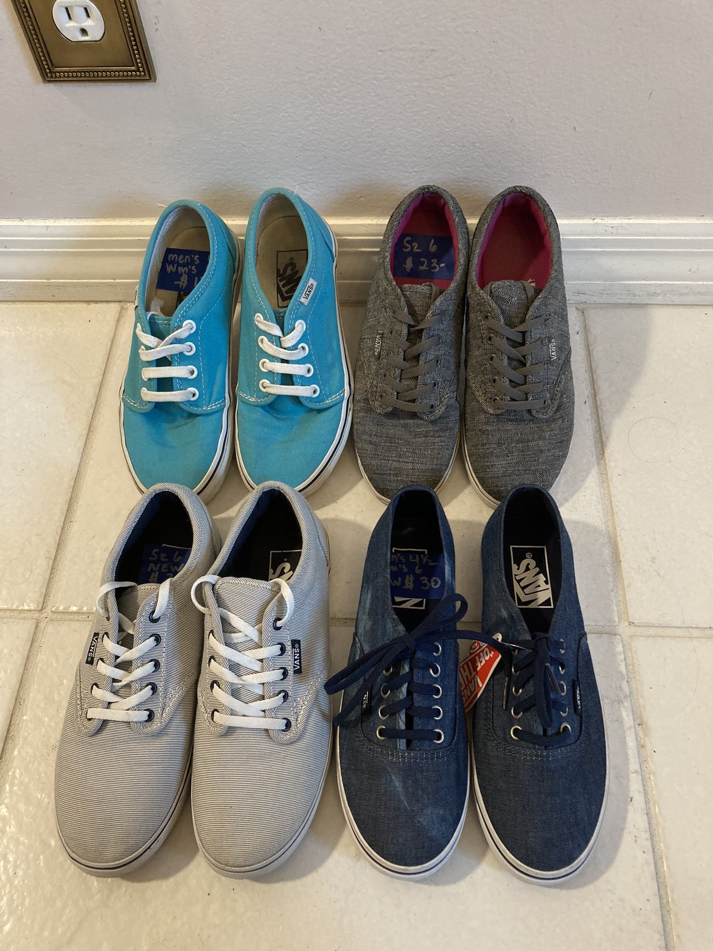$18 -Used Turquoise-Men’s 4-Women’s 5.5 $23 -Used/Like New Gray-Women’s 6 $30 -NEW Black & White Strip-Women’s 6 $30 - NEW Washed Denim-Men’s 4.5-Women’s 6