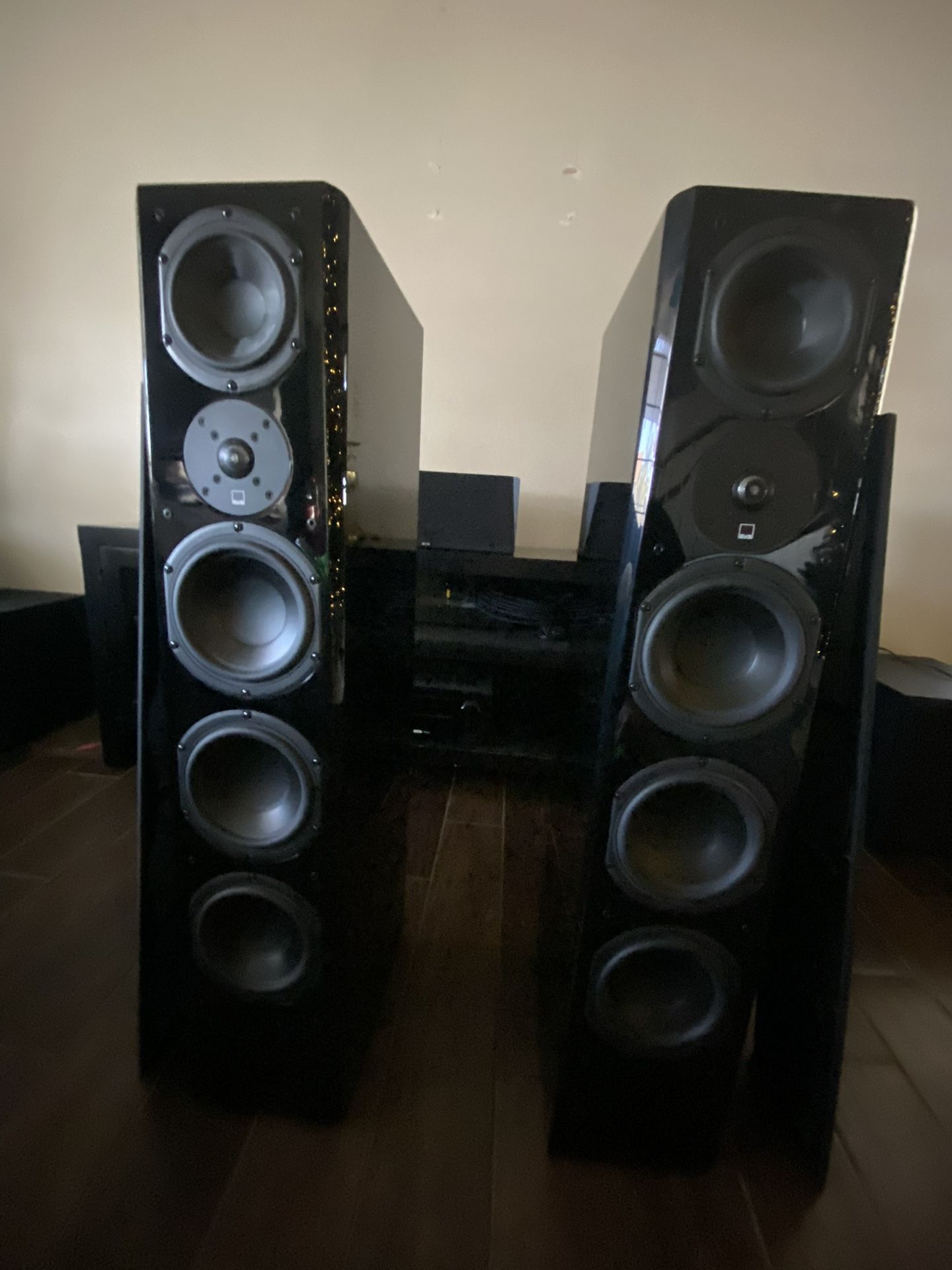 Denon AVR-X4500H 9.2 receiver 125 watt/channel 2 SVS Prime Pinnacle Tower Speakers in Piano Gloss Finish 1 SVS Prime Center Speaker 2 400 watt Klipsch 12” powered Subwoofers