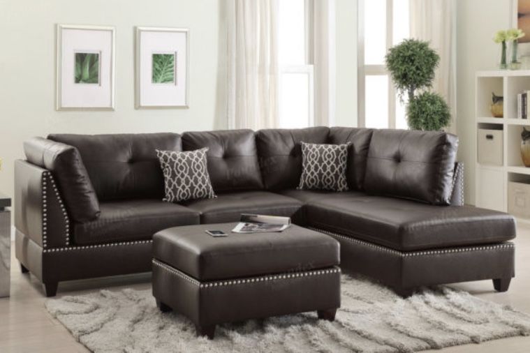 Sectional Sofa + Ottoman Color: Espresso Materials: Bonded Leather Plywood base panel with solid pine frame Wood legs Fiber batting back cushion Pocket coil seat cushion with foam encasement Some Assembly Required Dimensions: Sectional: 104″ x 75″, Ottoman: 35″ x 24″ x 19″H