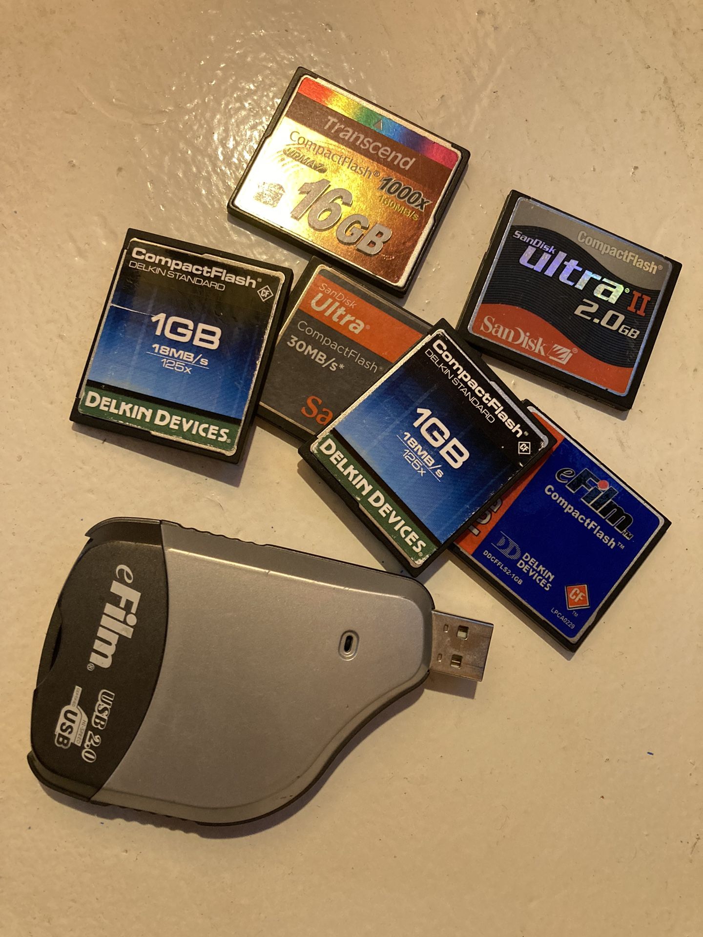 25GB total of CF cards and a CF reader, all lightly used. Excellent value!! 1 San Disk Ultra II - 2GB 1 San Disk Ultra - 4GB 1 Transcend - 16GB 2 Delkin Devices - 1GB each 1 Delkin Devices eFilm - 1GB 1 USB CF Card Reader