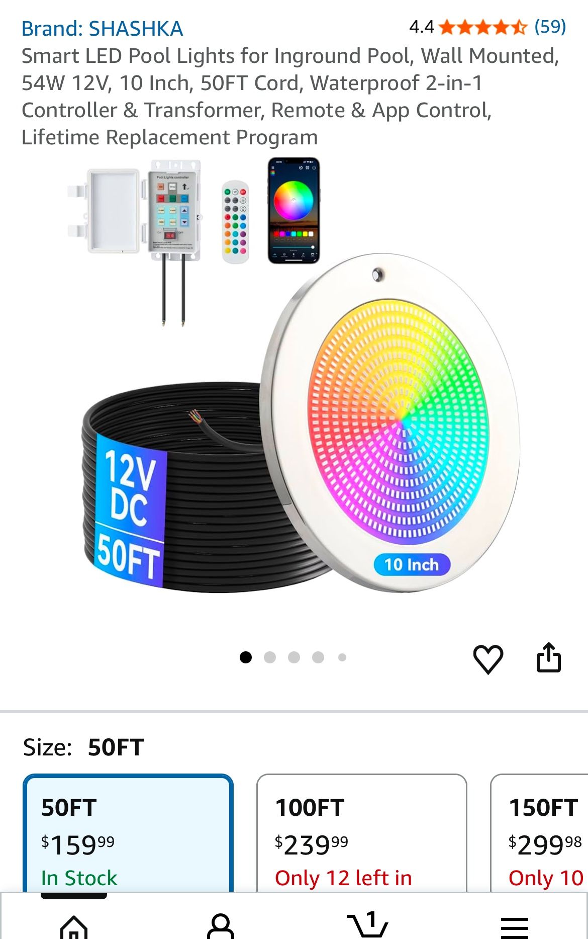 Smart LED Pool Lights for Inground Pool, Wall Mounted, 54W 12V, 10 Inch, 50FT Cord, Waterproof 2-in-1 Controller & Transformer, Remote & App Control,