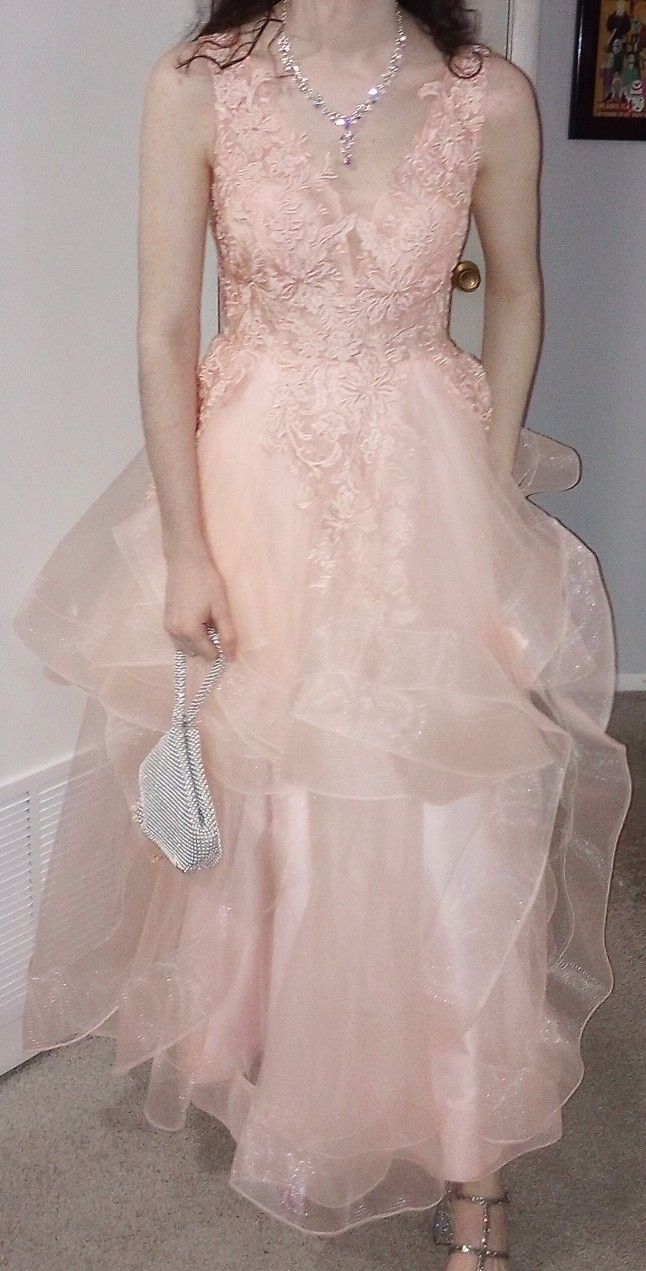 Prom dress worn once Color: Blush Pink Size: 4 Bust: 33-1/2" Waist: 26-1/2" Hips: 36-1/2" Hollow to floor: 58" Features: fluffy layered long prom dress, lace applique, ruffly tulle a-line formal dresses for teens, spaghetti strap floor length evening ball gowns, junior's sleeveless quinceanera dresses, adjustable lace up back,built-in bra.