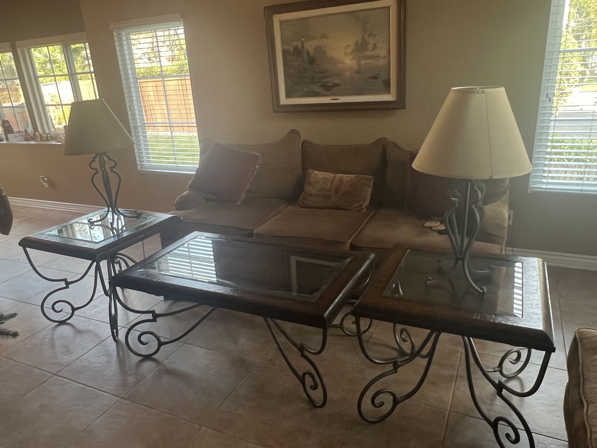 Coffee table, two end tables, two lamps for sale. Good condition, cash only.
