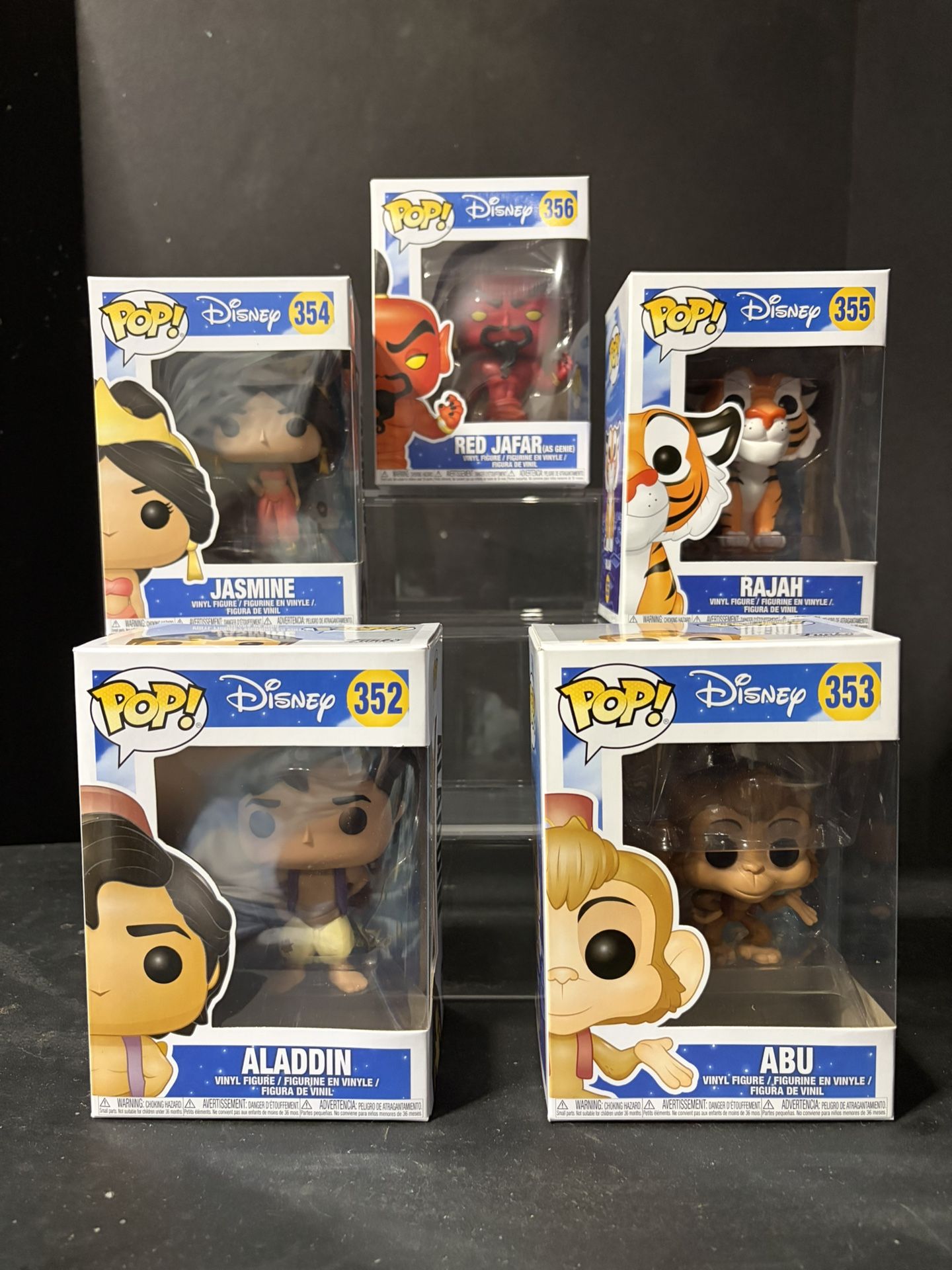 5 brand new never opened Disney Aladdin Funko Pops. Aladdin, Jasmine, Abu, Rajah, and Red Jafar.