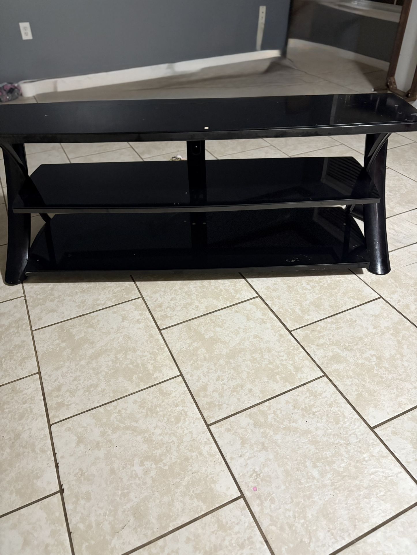 Gently used black tv stand that fits a 75 inch tv stand . It’s heavy duty and Stable .