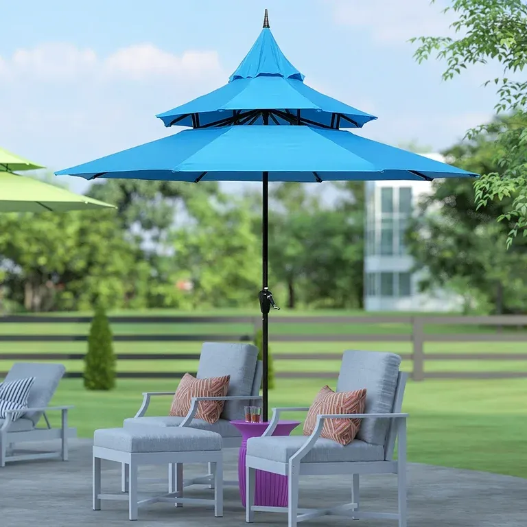 Open box. New in box. Pick up in Pomona . Bring timeless sophistication to your patio or garden with Maypex 3-Tier Pagoda Design Market Umbrella. Inspired by traditional Asian architecture, this elegant umbrella features a layered canopy that not only makes a statement but also enhances airflow for cooler, more comfortable shade. Crafted with durable, fade-resistant fabric and a sturdy frame, it's as functional as it is beautiful. Whether shading a chic cafe terrace or your backyard oasis, this umbrella delivers refined style with everyday practicality. Available in multiple colors and sizes to match any outdoor decor. Stylish Pagoda Design - Unique 3-tier silhouette adds visual elegance Superior Wind Stability - Multi-tier venting allows air to flow freely, reducing wind pressure Cool & Comfortable - Increased circulation keeps shaded areas breezy and pleasant Generous 9 ft. Shade Coverage - Fits 42"-54" tables with 4 to 6 chairs Reinforced Steel Rib Structure - 8 durable steel ribs provide strong canopy support Easy Crank Lift System - Opens and closes the umbrella with minimal effort Ideal for Residential & Commercial Use - Perfect for patios, restaurants, or poolside Umbrella Base Not Included - Must be purchased separately