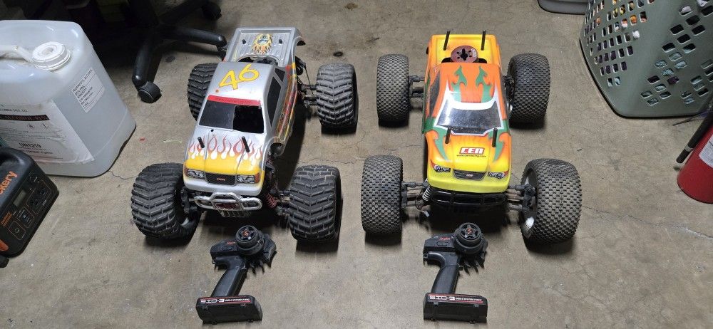 Selling these, two Cen monster trucks for some one i know. blue framed truck is mainly a parts truck. Red frame truck it is complete other than needing fresh air filter foam and probably new fuel line . Don't know if The red framed truck engine runs. Both trucks have radios. Selling them as a pear, we're looking to get 600 hundred dollars.