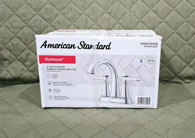 New American Standard Rumsom 4" bath faucet. Chrome finish. Includes pop-up drain. Easy installation. Lifetime limited warranty. Please check my profile for your peace of mind. Brand New, Factory Sealed! Meetup will be at the Skokie CVS. Cash only. 💰