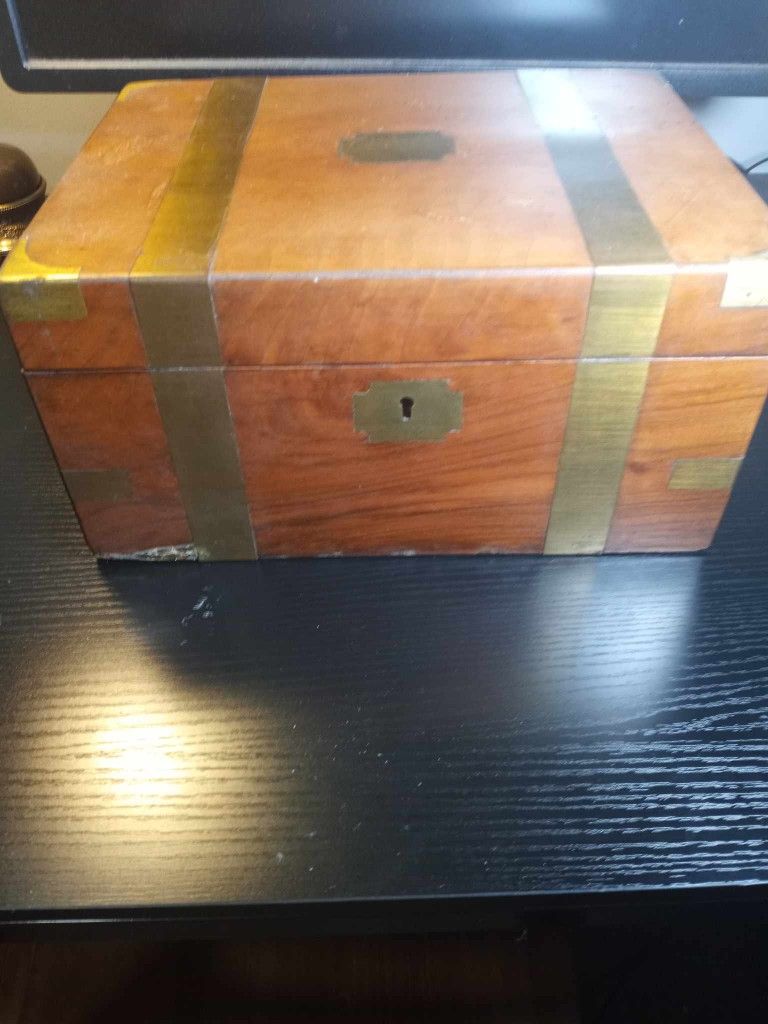 1860's Antique Walnut/brass bound Victorian lap desk box. has original ink well leather pad is in good condition see pictures for details. NO KEY Etsy picture is for reference only. ****Serious Inquiries Only****