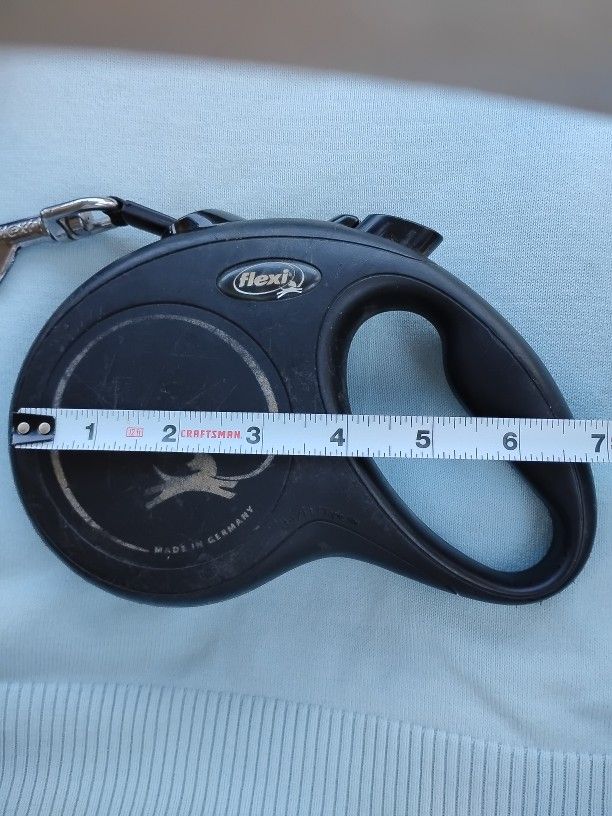 Flexi retractable dog leash. Made in Germany. For dogs up to 100 lbs. Good condition, hardly used, we preferred the regular type of leash to this. Shows minor scuffs/use etc. Retract feature is strong, lock/stop works well. CASH ONLY!!!
