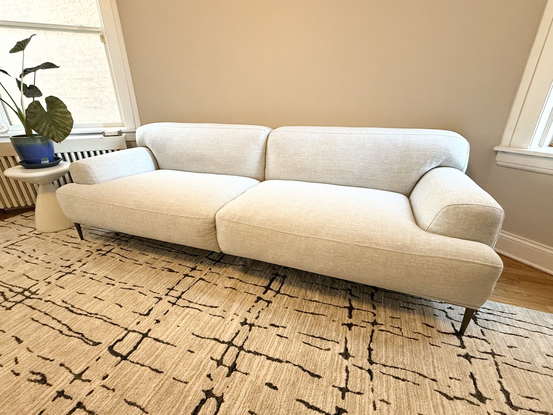 Like new sofa from Article! Part of their Abisko Collection. Color is white quartz and is a light soft grey. Never used in a primary seating area and both fabric and cushion fill are in near perfect condition. See full dimensions in photos.