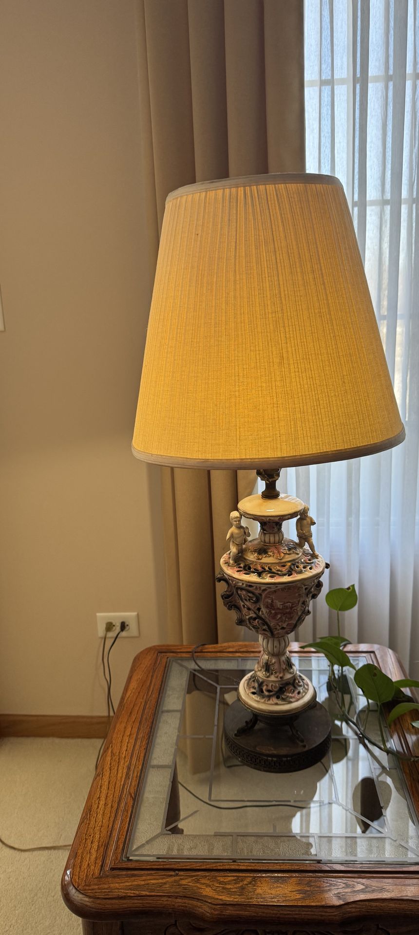 It could possibly be 100 years old. It works. The arms are missing almost exactly the same on both sides. The lamp itself is 30 inches tal with the shade it is 34 inches. It actually is pretty.
