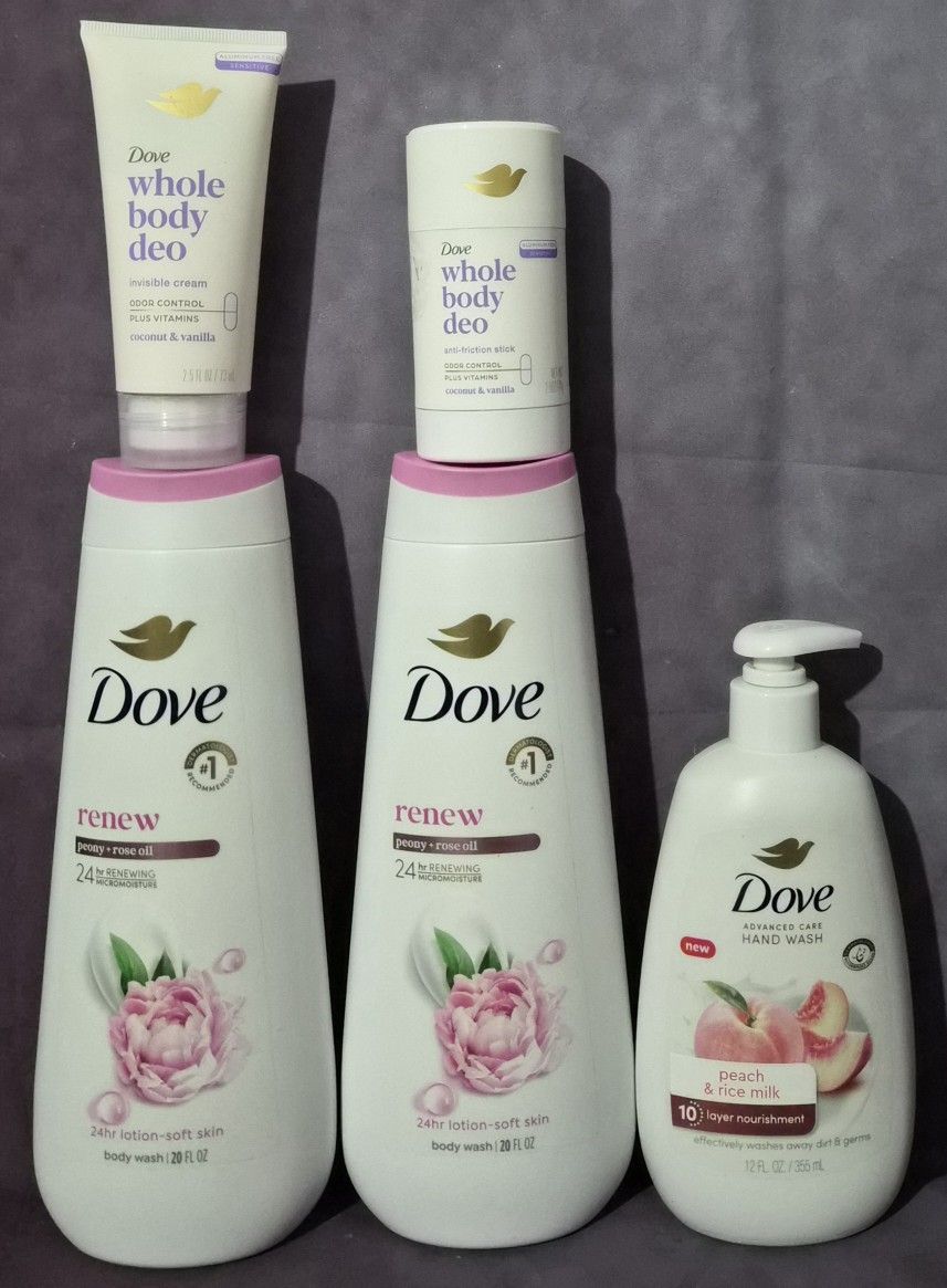 Pack Includes: 2- Dove Peony+Rose Oil Body Wash 20oz 1- Dove Peach&Rice Milk Hand Wash 12oz 1- Dove Coconut&Vanilla Whole Body Deo Cream 2.5oz 1- Dove Coconut&Vanilla Whole Body Deo Stick 2.6oz