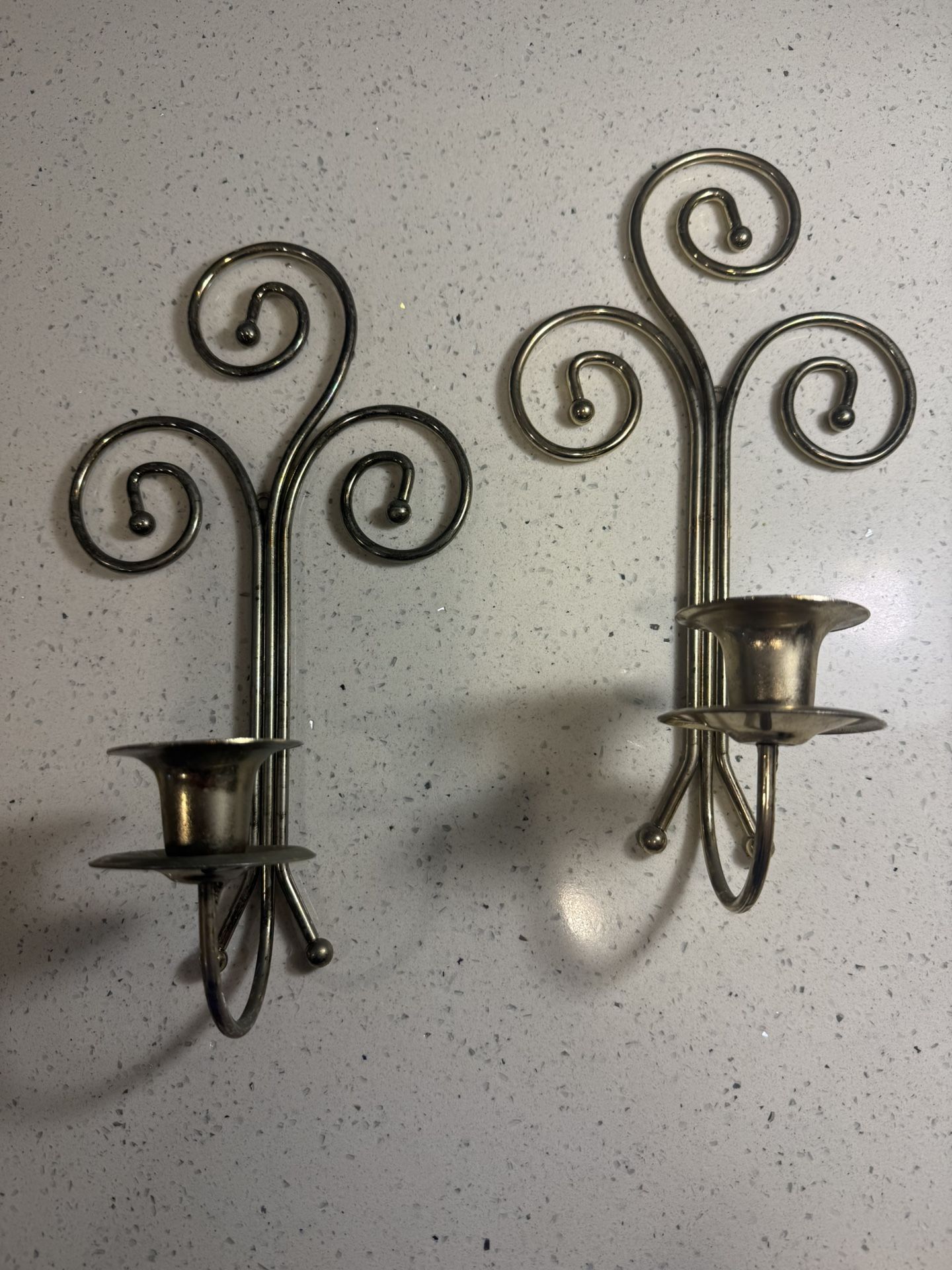 Beautiful vintage wall-mounted candle sconces featuring elegant brass swirl scrollwork. Classic mid-century style with a timeless decorative look. Solid metal construction with single taper candle cups and built-in drip trays. Details: • Matching pair • Solid brass-tone metal • Wall mount design • Fits standard taper candles • Built-in drip trays • Approx. 12–13” tall • Vintage condition with light age-appropriate patina Perfect for a dining room, entryway, bedroom, or flanking a fireplace or mirror. Great addition to traditional, mid-century, or Hollywood Regency style décor.
