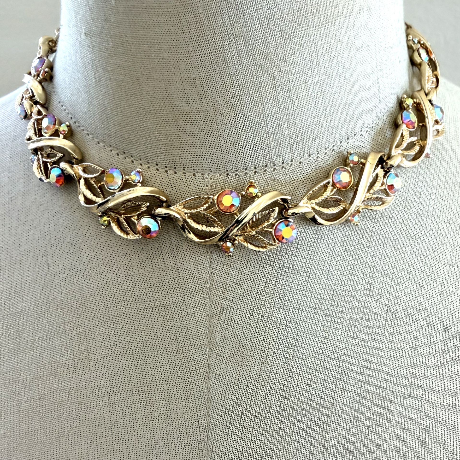 Vintage Gold Tone Leaf & Vine choker Necklace with Aurora Borealis Rhinestones Elegant gold-tone necklace featuring an ornate leaf and vine design accented with sparkling aurora borealis rhinestones. The stones catch the light beautifully with flashes of pink, green, gold, and blue, giving this piece that classic vintage shimmer. The front section has a sculptural, nature-inspired look, while the back is finished with an adjustable gold-tone chain and hook clasp for a comfortable fit. Striking enough to stand alone, but still refined and wearable. This style pairs perfectly with a simple black top, a vintage dress, or anything that lets the details shine. Very good vintage condition ✨ Hook clasp with extender chain