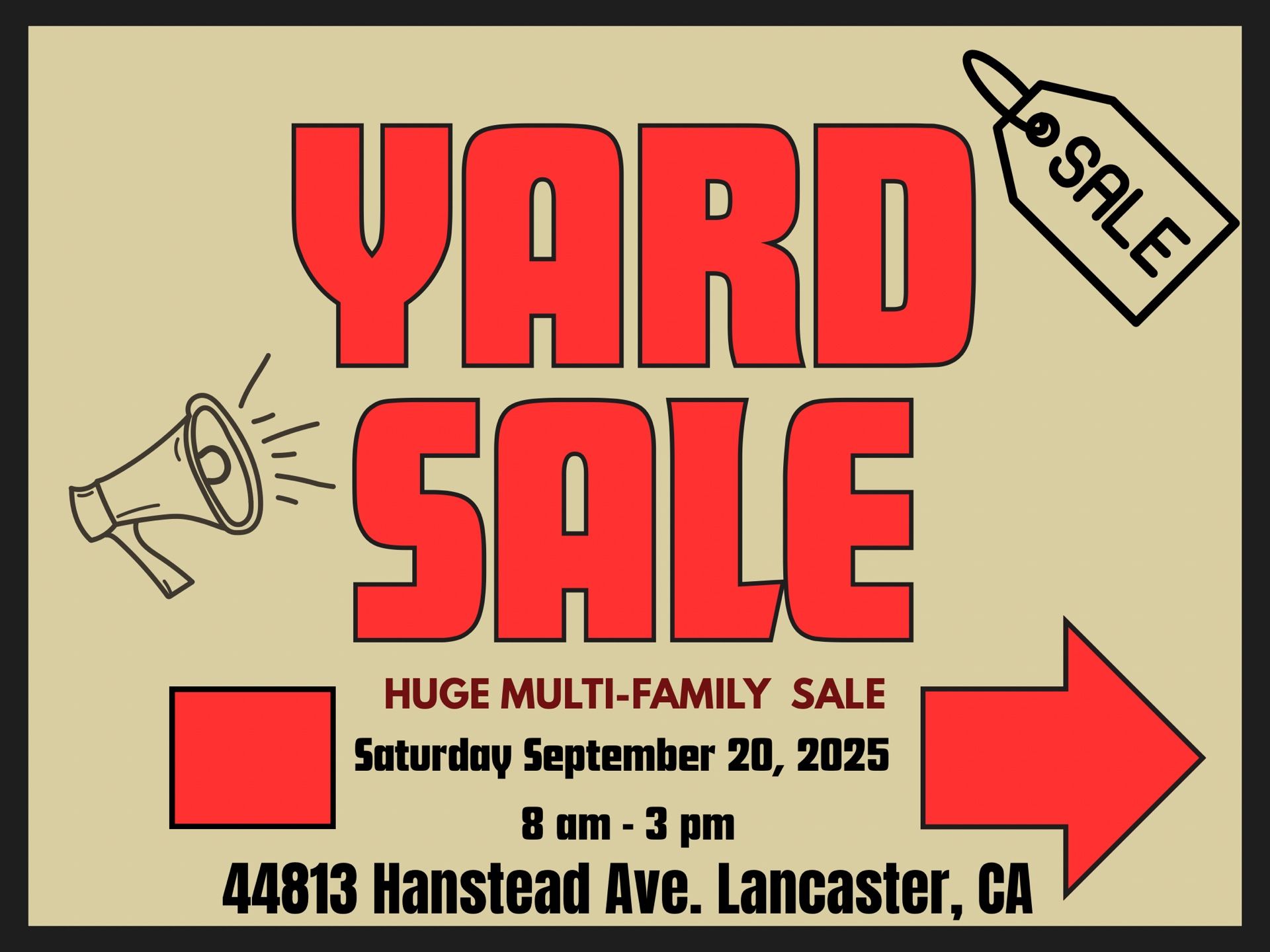 New and used items. Everything must go! Multi family sale, take advantage! Follow the neon signs! Info on picture Venta grande multifamiliar. 9/20/25 Direccion en la foto